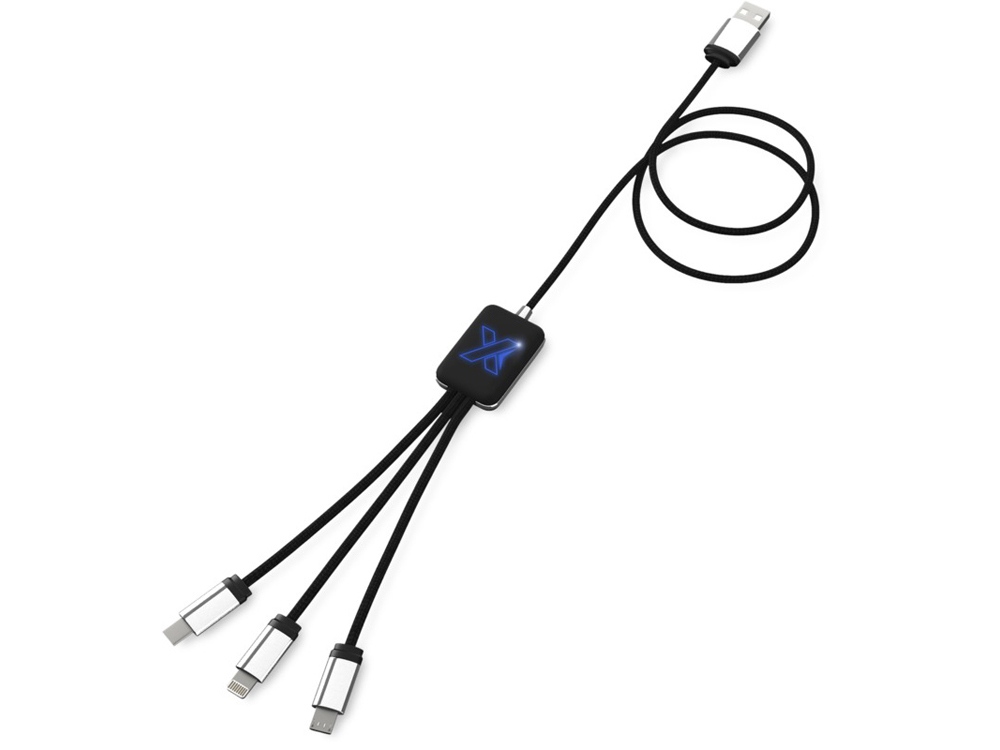 Кабель с soft-touch и металлическим покрытием, а также светящимся логотипом, оснащен тремя разъемами для зарядки (тип C, Android, iPhone). Можно заряжать до трех устройств одновременно. Длина кабелей (со штекерами): 10 см. Общая длина: 1 метр. Упаковка изготовлена из бумаги и пластика вторичной переработки.
