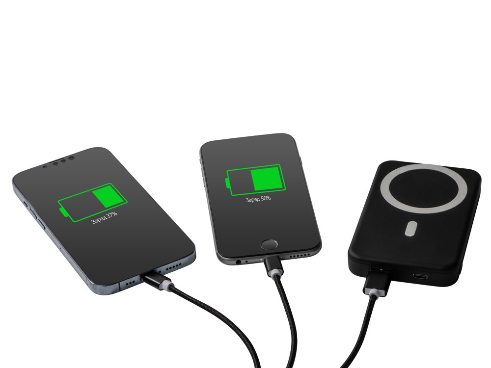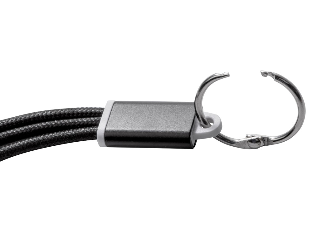 Кабель для зарядки Tres 3-в-1 с брелоком, коннекторами 1 type с, 1 USB type A и двойным совместимым коннектором 2-в-1 для устройств с ОС Apple® iOS и Android. В комплект входит брелок. Для зарядки устройств Apple подключайте кабель стороной без контактов; для зарядки устройств с ОС Android подключайте кабель стороной с контактами. Алюминий.