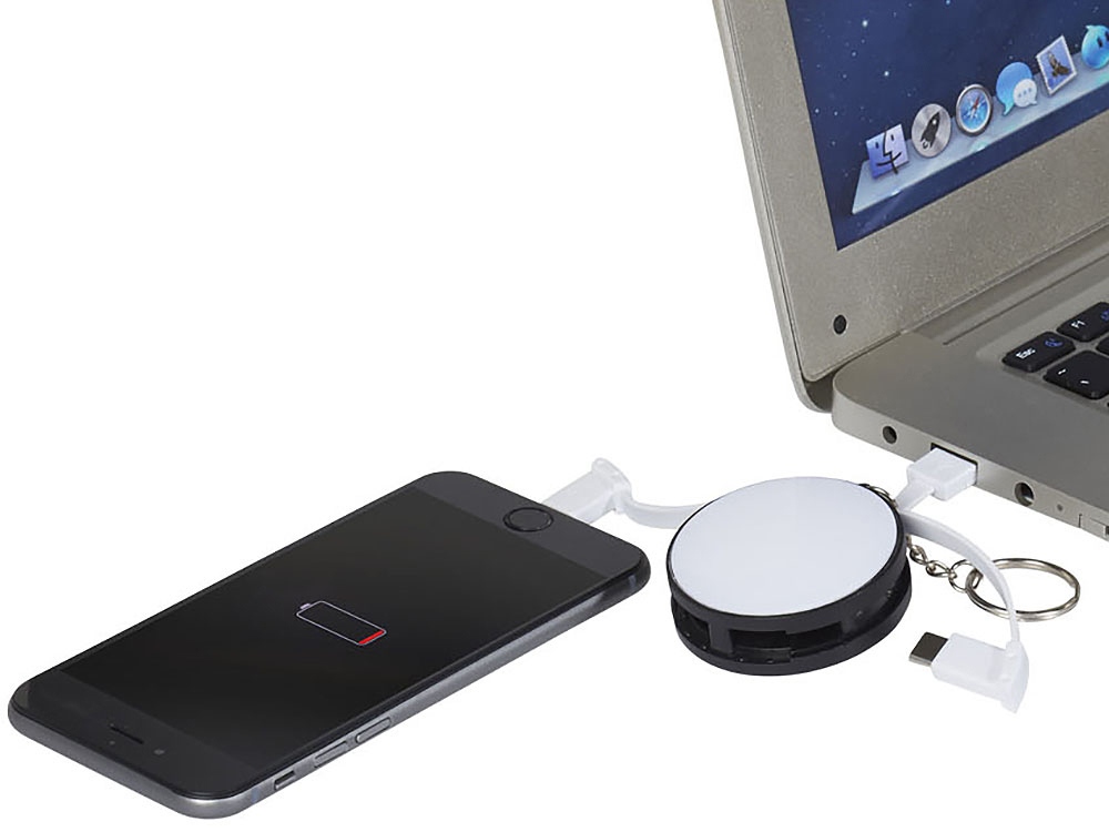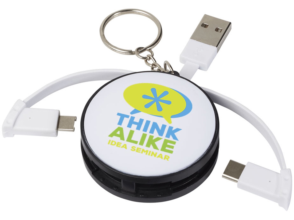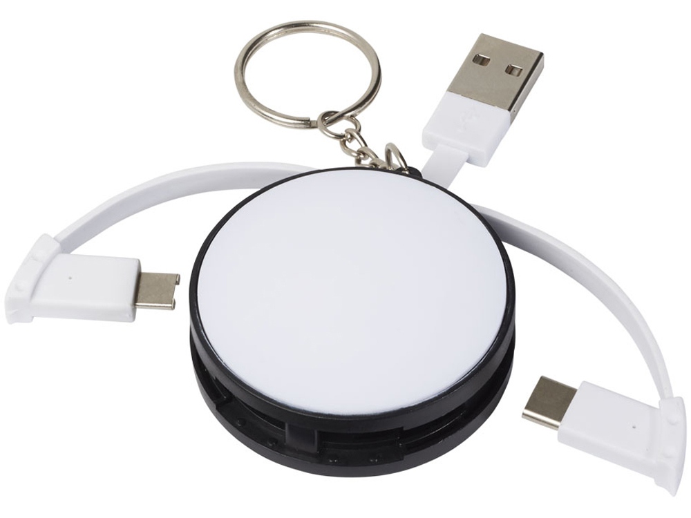 Кабель для зарядки 3-в-1. Кабель для зарядки Troop 3-в-1 с коннектором USB Type C и двойным совместимым коннектором 2-в-1 для устройств Apple® iOS и Android. Кабель оснащен карабином для удобного крепления к сумке. АБС-пластик.