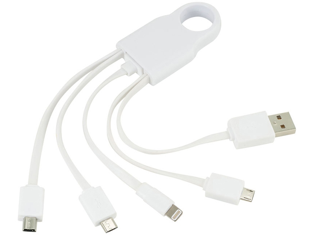Кабель для зарядки Squad 4-в-1. Зарядник USB с пятью кабелями коннекторами; адаптер USB, два микро USB адаптера, мини USB адаптер и съемный адаптер Apple® Lightning™ сертифицированный MFi. Только адаптер микро USB и Lightning™ поддерживают передачу данных. АБС пластик. Тампопечать (1 цвет (белые изделия)) на данный товар осуществляется бесплатно. Оплачивается только настройка оборудования в размере 3600 рублей на весь тираж.
