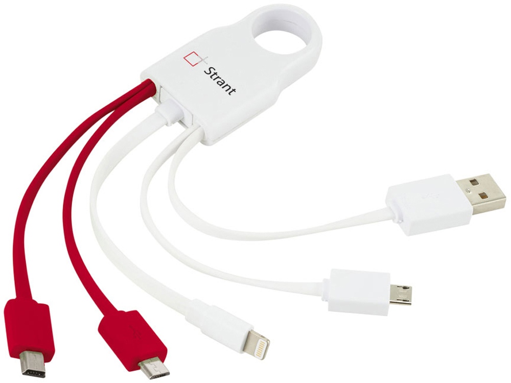 Кабель для зарядки Squad 4-в-1. Зарядник USB с пятью кабелями коннекторами; адаптер USB, два микро USB адаптера, мини USB адаптер и съемный адаптер Apple® Lightning™ сертифицированный MFi. Только адаптер микро USB и Lightning™ поддерживают передачу данных. АБС пластик. Тампопечать (1 цвет (белые изделия)) на данный товар осуществляется бесплатно. Оплачивается только настройка оборудования в размере 3600 рублей на весь тираж.