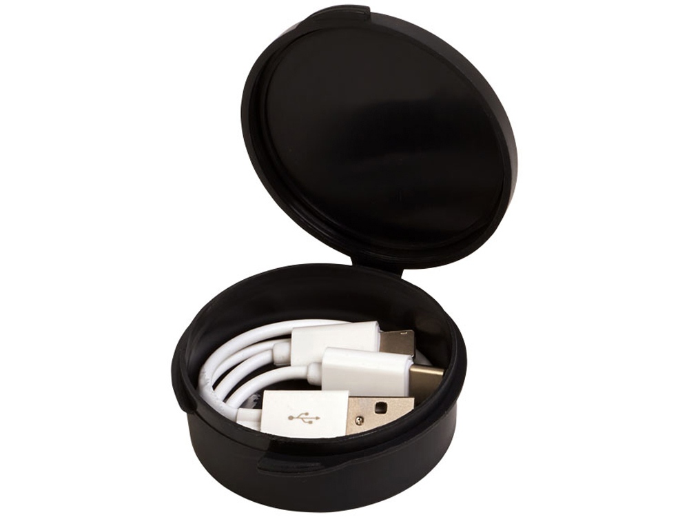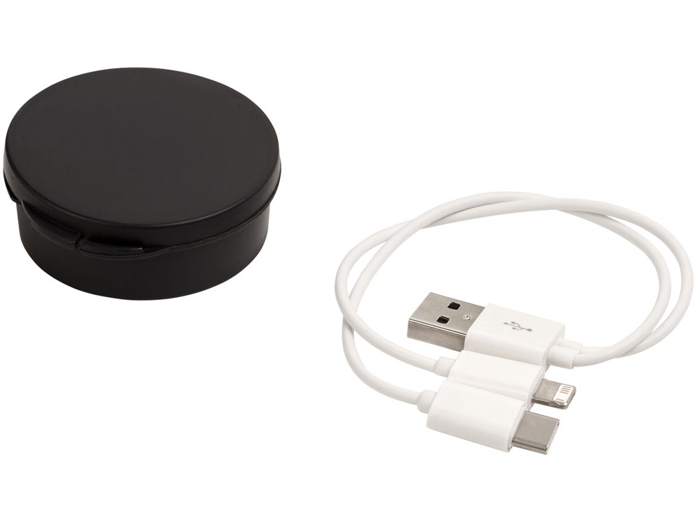 Кабель для зарядки Versa 3-в-1 в футляре. Кабель для зарядки Versa 3-в-1 в круглом футляре с кабелем USB с несколькими коннекторами, включая USB Type C и двойной совместимый коннектор 2-в-1 для устройств Apple® iOS и Android. АБС-пластик. Тампопечать (1 цвет (цветные изделия)) на данный товар осуществляется бесплатно. Оплачивается только настройка оборудования в размере 4000 рублей на весь тираж.