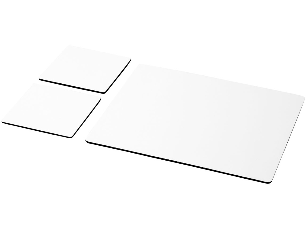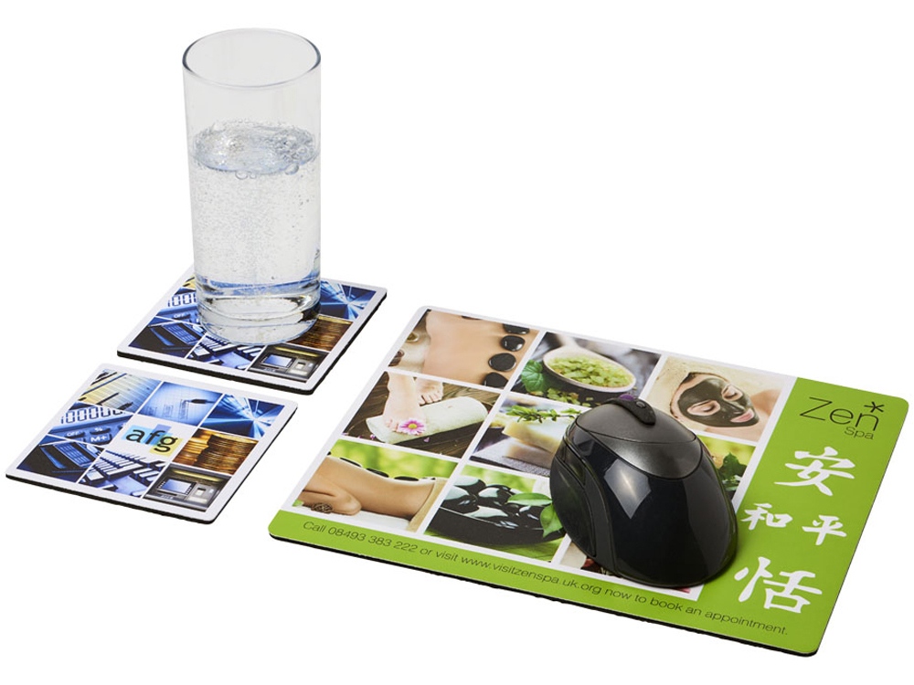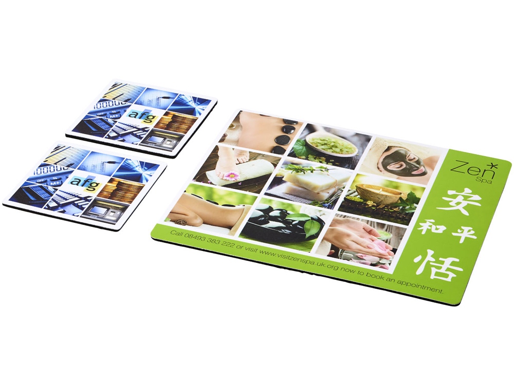 Комплект Q-Mat® из коврика для мыши и подставки 3. Особенности: коврик для мыши Q-Mat® и набор из двух соответствующих подставок с фирменным дизайном вашей компании. Набор состоит из прямоугольного коврика для мыши (0,3 х 23,5 х 20 см) и двух квадратных подставок (0,3 x 9,8 x 9,8 см). Вспененный полиэтилен ЭВА с ламинированной бумагой .