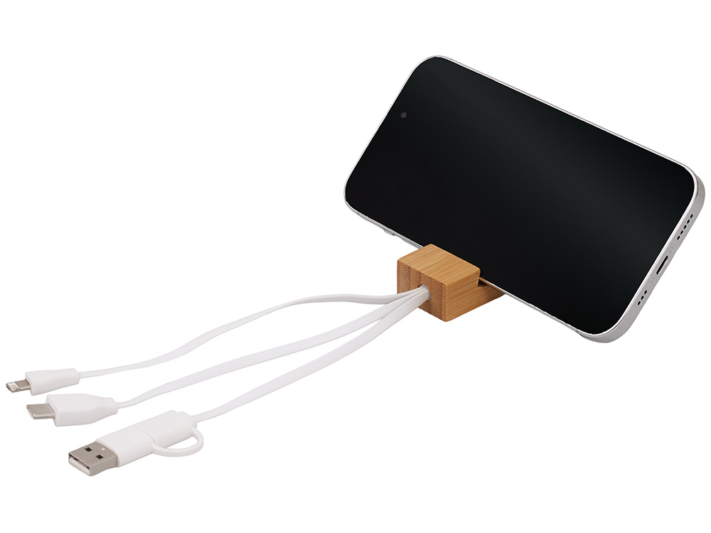 Корпус кабеля выполнен из натурального бамбука — экологически чистого и прочного материала. Деревянная подставка не только защищает кабель от перегибов, но и служит удобной опорой для телефона при видеозвонках, прослушивании музыки или просмотре видео.