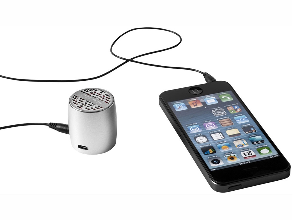Небольшая компактная колонка с кольцом для ключей и встроенным аккумулятором для 3 часов непрерывной музыки. Колонка включает аудиокабель и подключается к смартфону, планшету или любому другому медиаустройству с 3,5 мм аудиоразъемом. Также включает USB-кабель для зарядки, короткий шнурок. Гравировка (оптоволоконный лазер) (Без чернения) на данный товар осуществляется бесплатно. Оплачивается только настройка оборудования в размере 950 рублей на весь тираж.