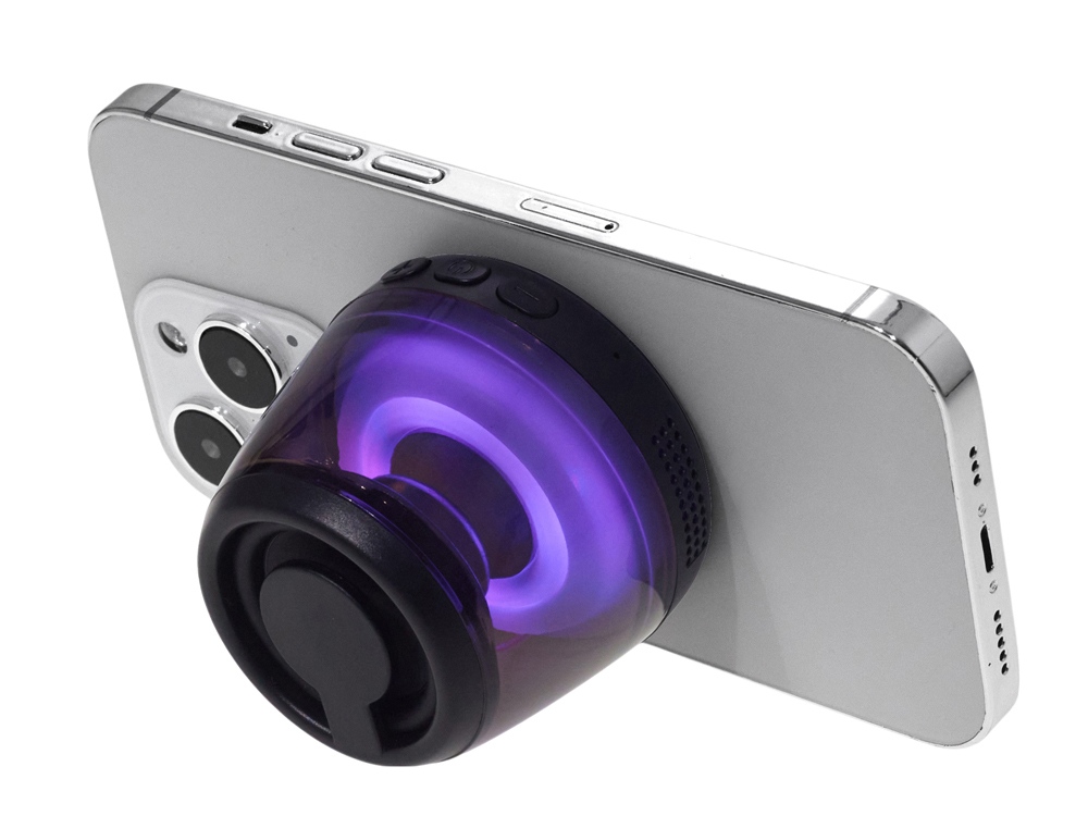 Современная магнитная Bluetooth-колонка колонка крепится к любому смартфону (iPhone -нативно, к другим -благодаря кольцу из комплекта). Это позволяет не только освободить руки, но и добавляет удобную подставку телефону. Динамик 40мм и мощностью 5 Вт обеспечивает сильное и насыщенное звучание даже в компактном корпусе. RGB подсветка имеет несколько режимов (переключение по трехразовому нажатию кнопки ВКЛ.). В комплекте кроме кольца – зарядный кабель USB-C и ремешок-ланъярд. Может принимать звонки и имеет разъем для micro SD карт памяти.