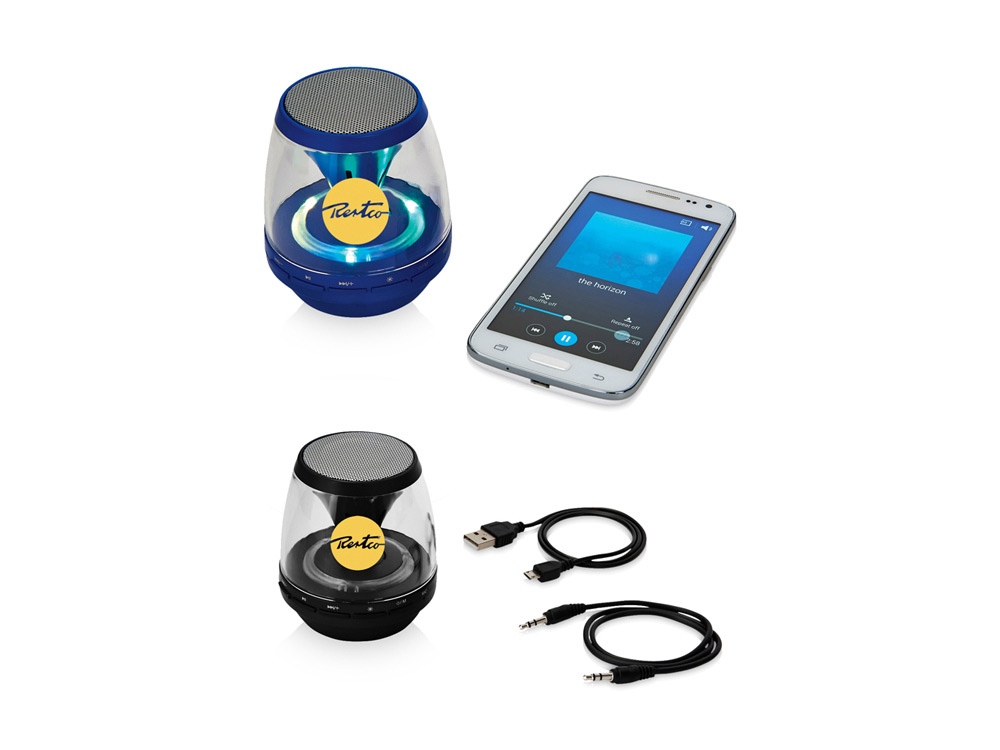 Колонка Rave Light Up Bluetooth®. Светодиодная портативная колонка с функцией Bluetooth® со встроенным перезаряжаемым аккумулятором для 4 часов непрерывной музыки. Во время воспроизведения музыки колонка светится семью цветами: красным, зеленым, синим, розовым, оранжевым, желтым, фиолетовым. Колонка подключается через Bluetooth® или 3,5 мм аудиокабель. Аудиокабель и кабель для зарядки включены в комплект. Пластик. 126. Тампопечать (1 цвет (цветные изделия)) на данный товар осуществляется бесплатно. Оплачивается только настройка оборудования в размере 3600 рублей на весь тираж.