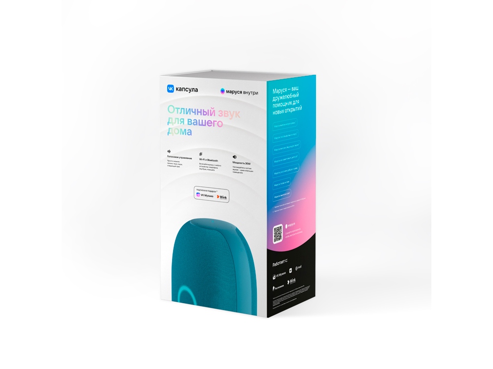 VK Капсула — умная колонка с мощным звуком. Наслаждайтесь музыкой — Маруся подберёт вам трек по вкусу. А ещё помурчит, если погладить колонку.