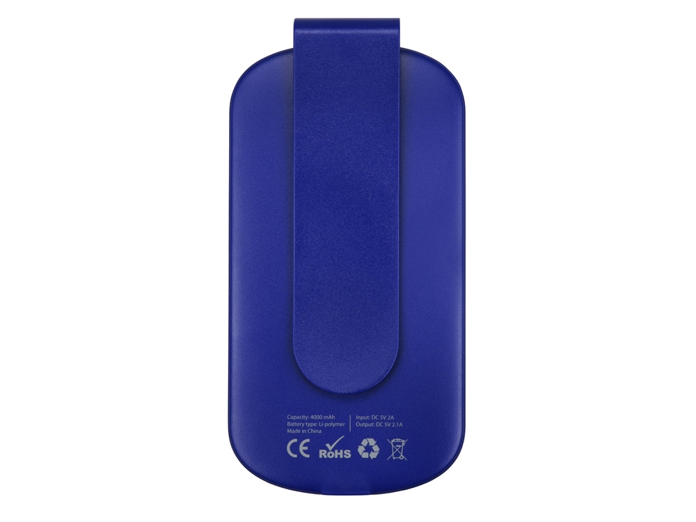 Портативное зарядное устройство Pin на 4000 mAh с большой площадью нанесения и клипом для крепления к одежде или сумке, синий