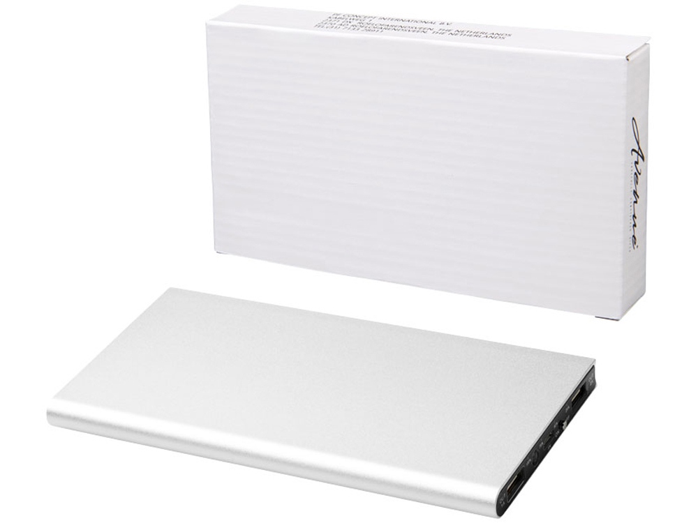 Алюминиевое портативное зарядное устройство Plate 8000 мАч. Алюминиевое портативное зарядное устройство Plate 8000 мА∙ч содержит литий-полимерную батарею на 8000 мА∙ч класса А и имеет тонкий корпус. Индикаторная светодиодная подсветка включается во время зарядки, а также показывает оставшийся заряд батареи в зарядном устройстве. Устройство поддерживает 5 В / 2 А на входе и выходе и изготовлено из прочного алюминия. В комплект входит кабель для зарядки (USB/Micro-USB). Поставляется в белой подарочной коробке Avenue. Алюминий.