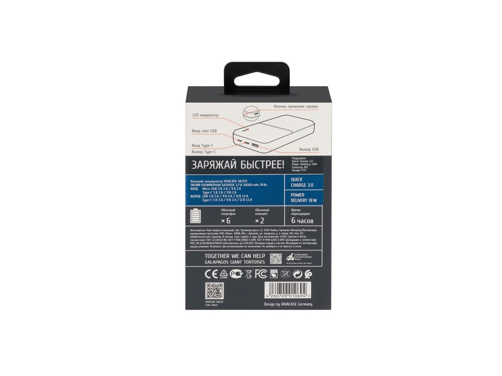 RIVACASE VA2571 (20000 мАч) QC/PD внешний аккумулятор, черный 12/24
