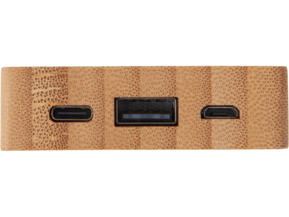 Компактный и стильный внешний аккумулятор ёмкостью 5 000 мАч — идеальный спутник для повседневных дел и коротких поездок. Его корпус сочетает в себе натуральный бамбук и переработанный ABS-пластик, что делает устройство не только более экологичным, но и визуально премиальным. Особый шарм ему придаёт встроенная панель с белой подсветкой с возможностью нанесения логотипа — ваш бренд или инициалы мягко засветятся в темноте, привлекая внимание и подчеркивая индивидуальность. Это не просто power bank — это экосознательный аксессуар, который заряжает ваши гаджеты и вдохновляет окружающих.