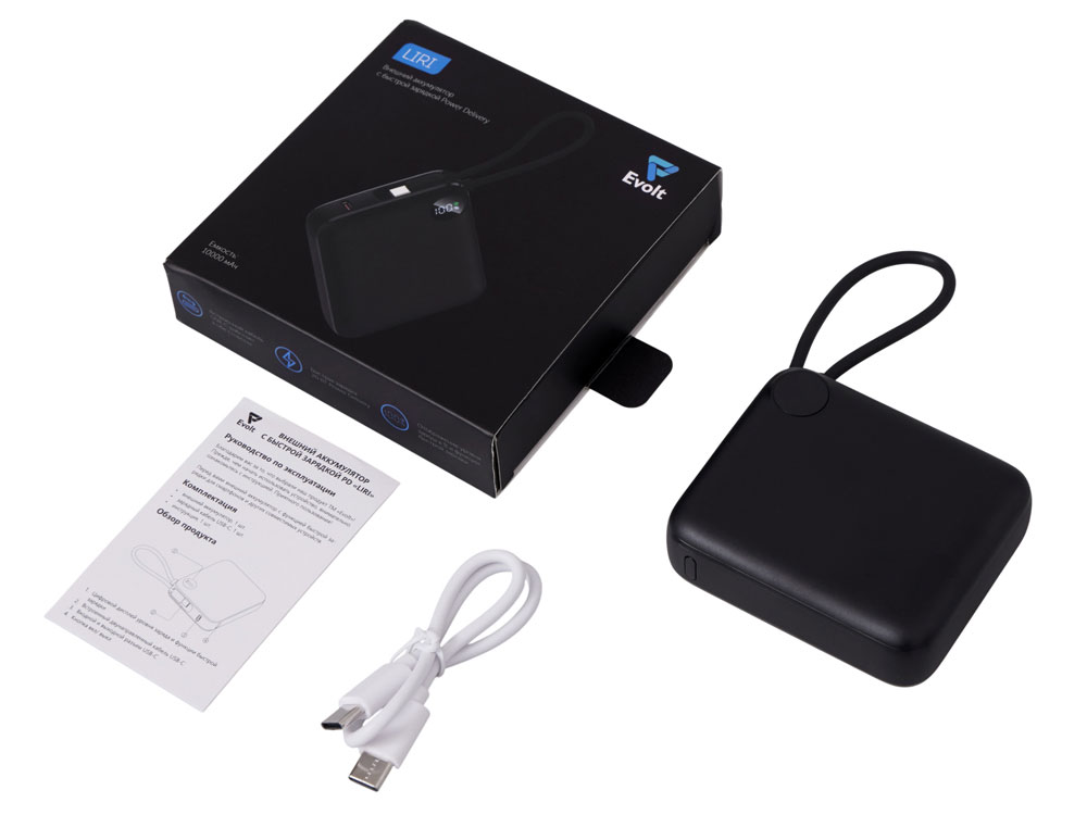 - Встроенный двунаправленный кабель-петелька USB-C — всегда под рукой! Заряжает смартфоны по USB-C (в т.ч. новые iPhone), а также заряжается сам по встроенному кабелю.