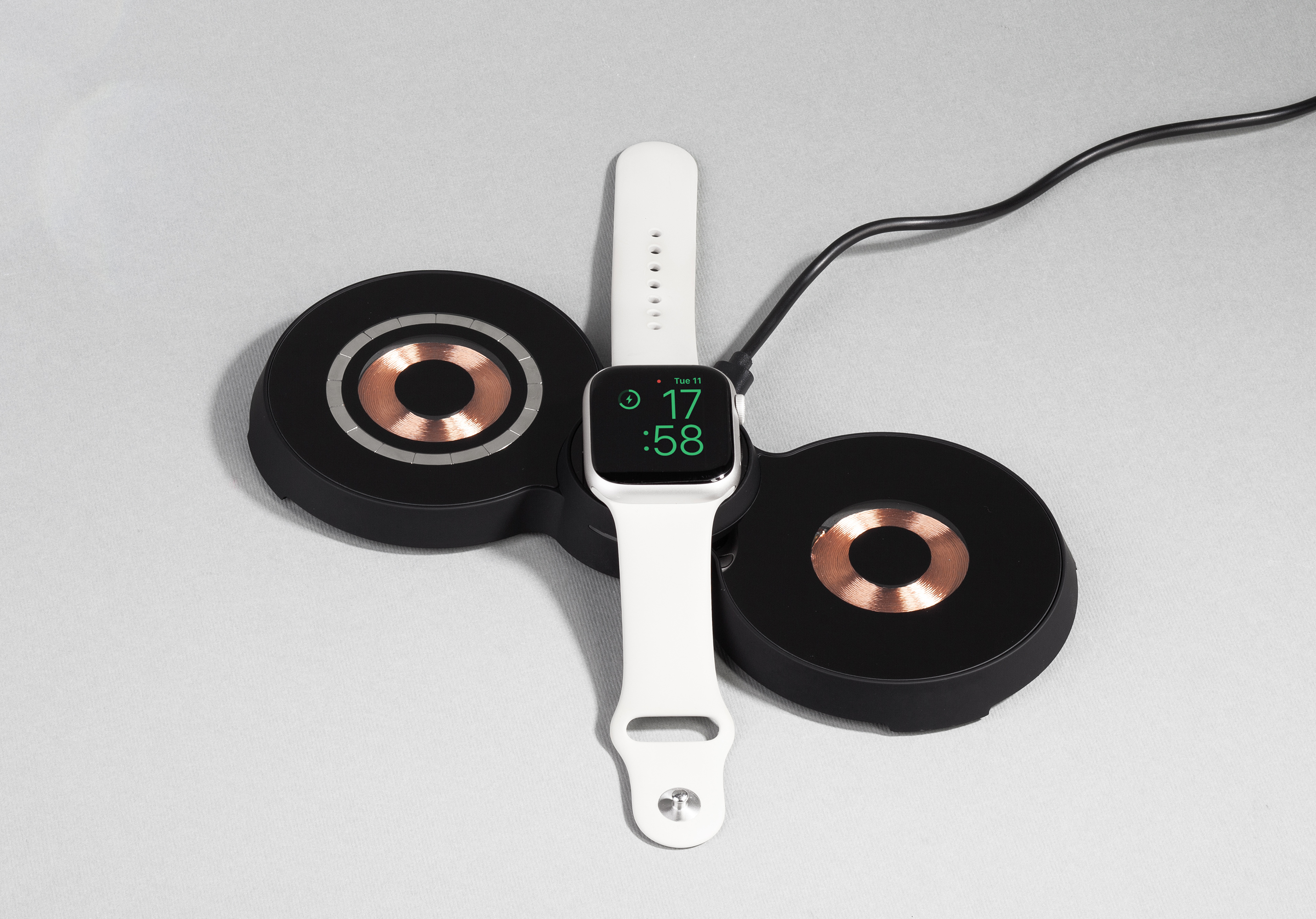 Благодаря прозрачному корпусу видны две зарядные оранжевые катушки повышенной мощности 15W и серебристое магнитное кольцо MagSafe, позволяющее удобно размещать iPhone 12 серии и выше. В центре станции - зарядный блок для смарт-часов.