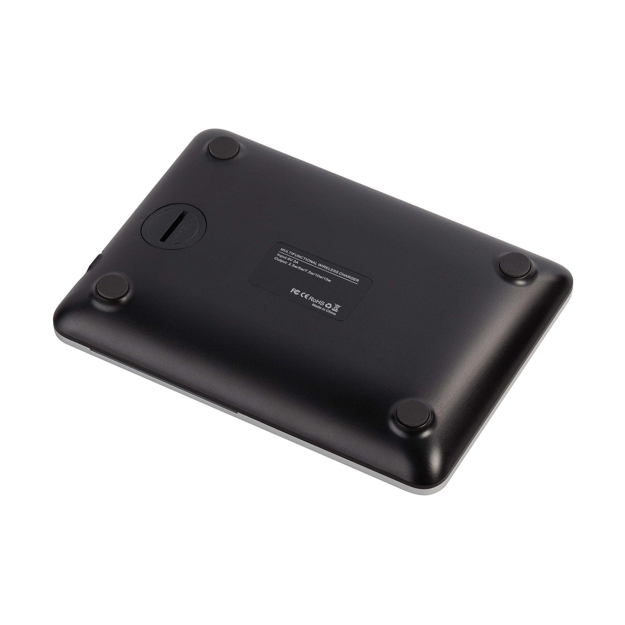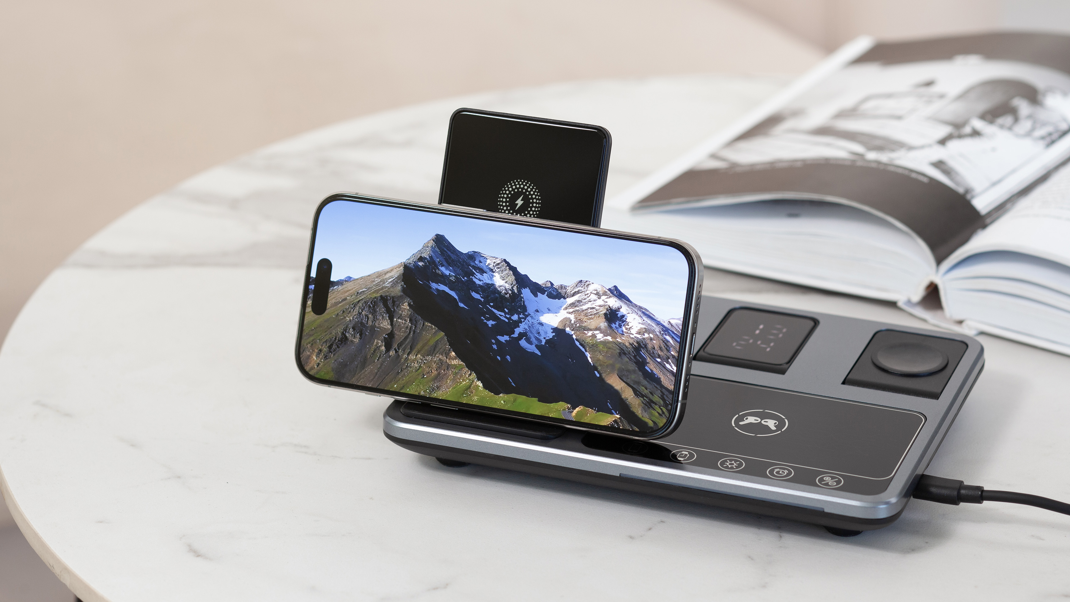 Автоматические подъёмные механизмы зарядных панелей для смартфона и смарт-часов Apple Watch управляются сенсорными кнопками, расположенными под зарядным блоком для наушников. Дисплей электронных часов поднимается/опускается одновременно с зарядной панелью смарт-часов. Также сенсорными кнопками управляются режимы ночной подсветки, установки времени и будильников. 2 зярядные катушки в панели быстрой зарядки смартфона позволяют располагать его как вертикально, так и горизонтально, в обоих положениях поддерживая зарядный процесс.