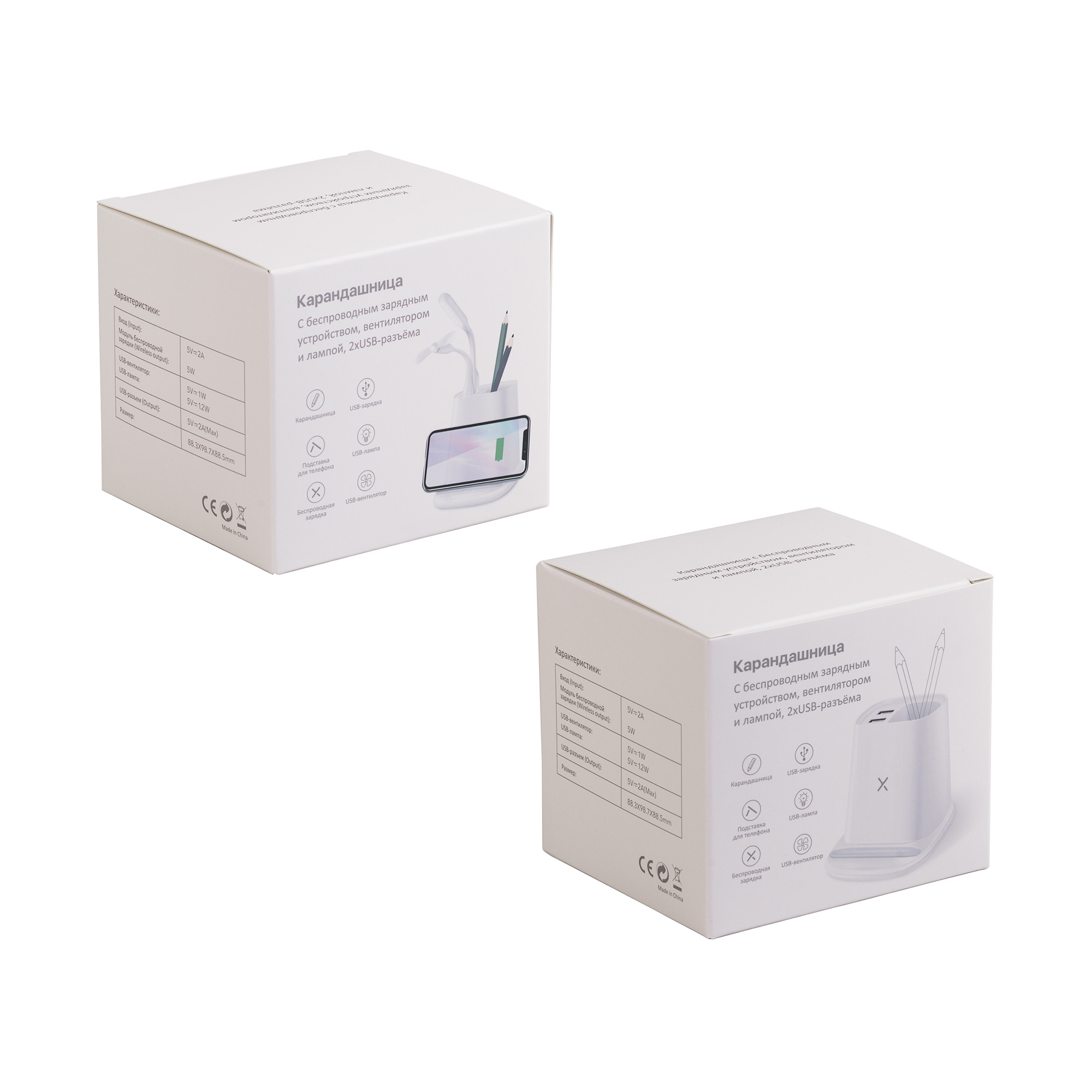 Карандашница "Smart Stand" с беспроводным зарядным устройством, вентилятором и лампой (2USB разъёма), белый