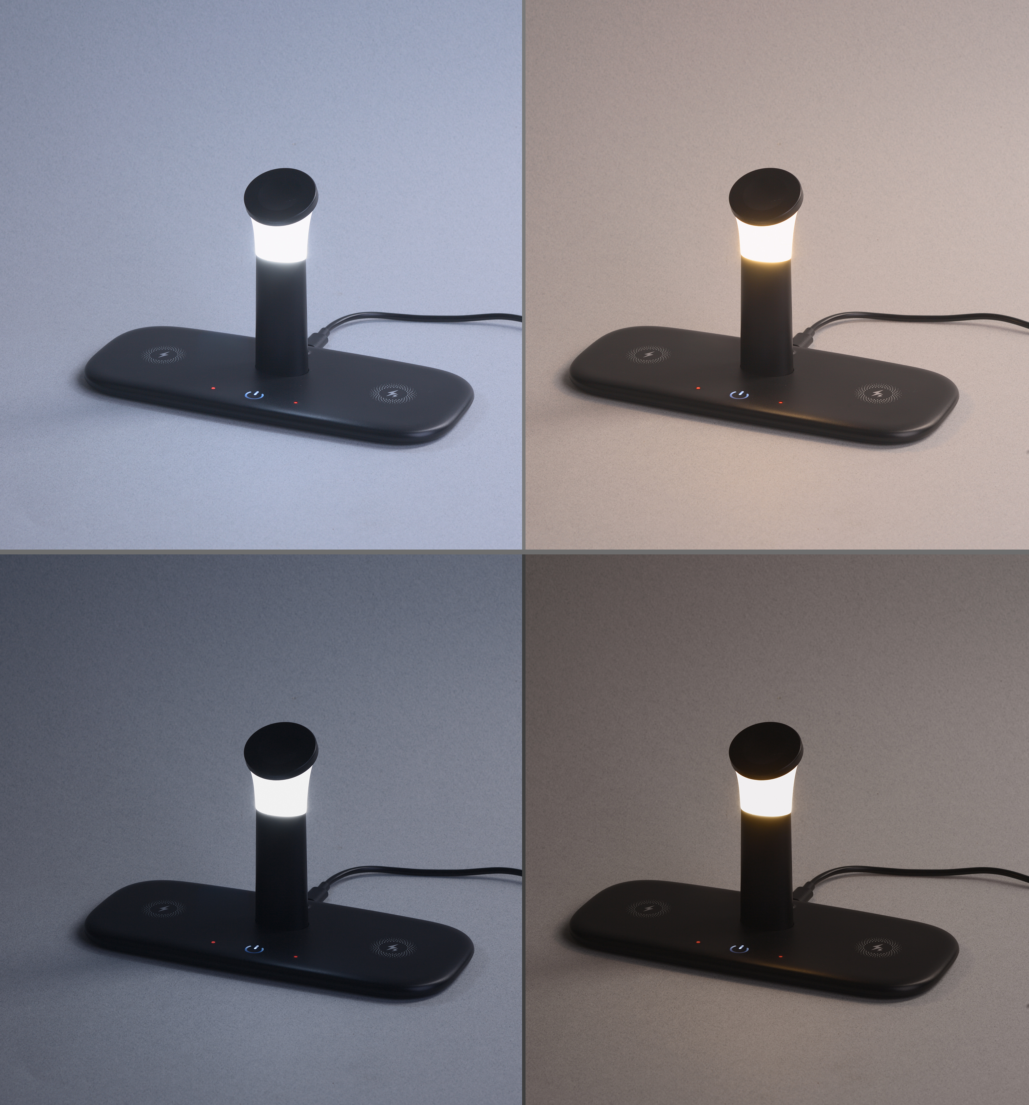 Настольная зарядная станция - это компактное решение для одновременной быстрой 15W беспроводной зарядки смарт-часов (Apple watch), наушников и смартфонов. У лампы доступны 2 режима освещения: холодный свет и теплый свет. В каждом из режимов можно регулировать яркость света. Блок быстрой (до 15W) беспроводной зарядки смартфона обозначен двумя молниями; блок, обозначенный одной молнией, заряжает с мощностью 5W. Желательно перед использованием ознакомиться с инструкцией.