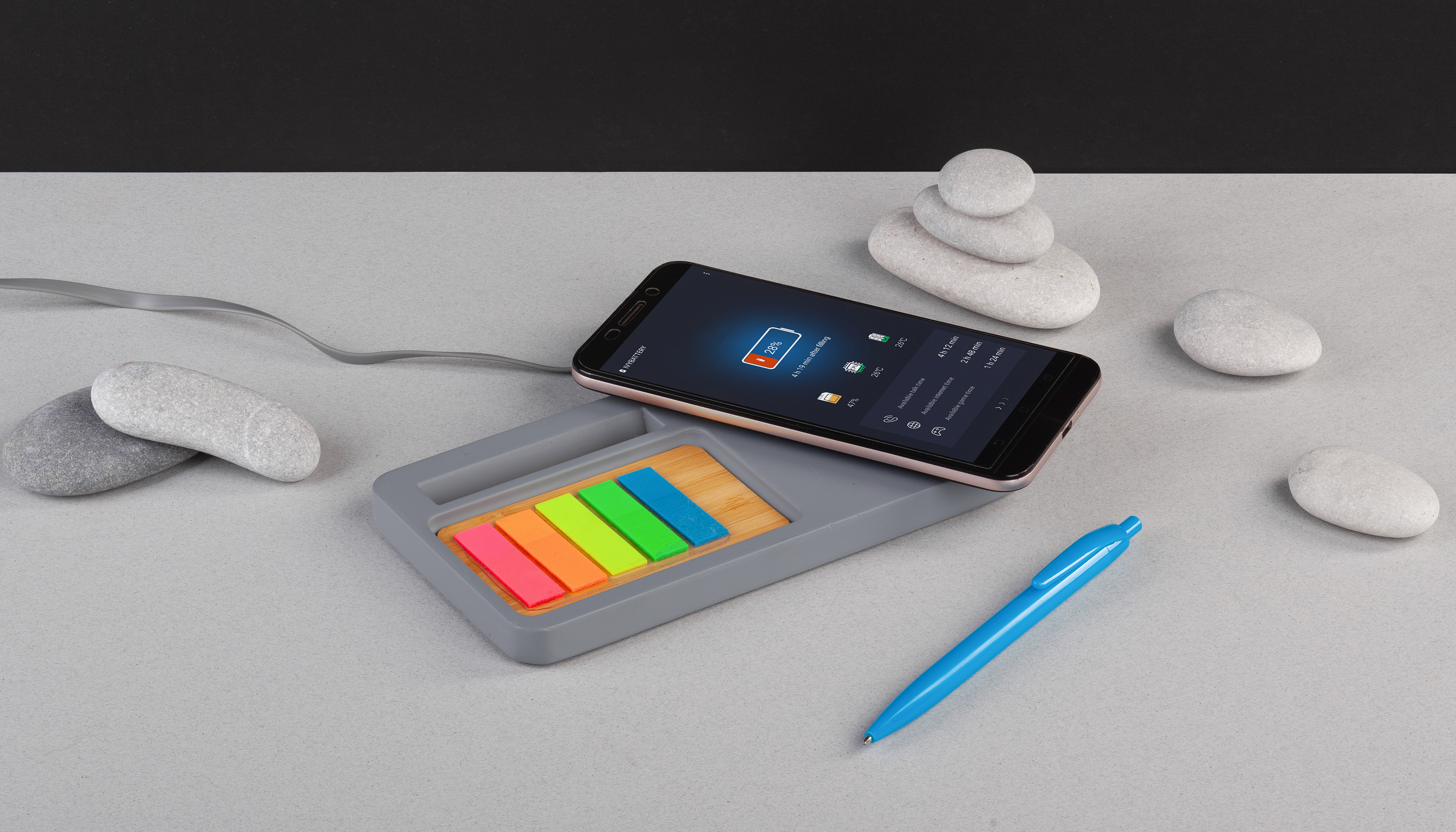 Настольный органайзер "Stonehenge" с беспроводным зарядным устройством, камень/бамбук, серый/бежевый