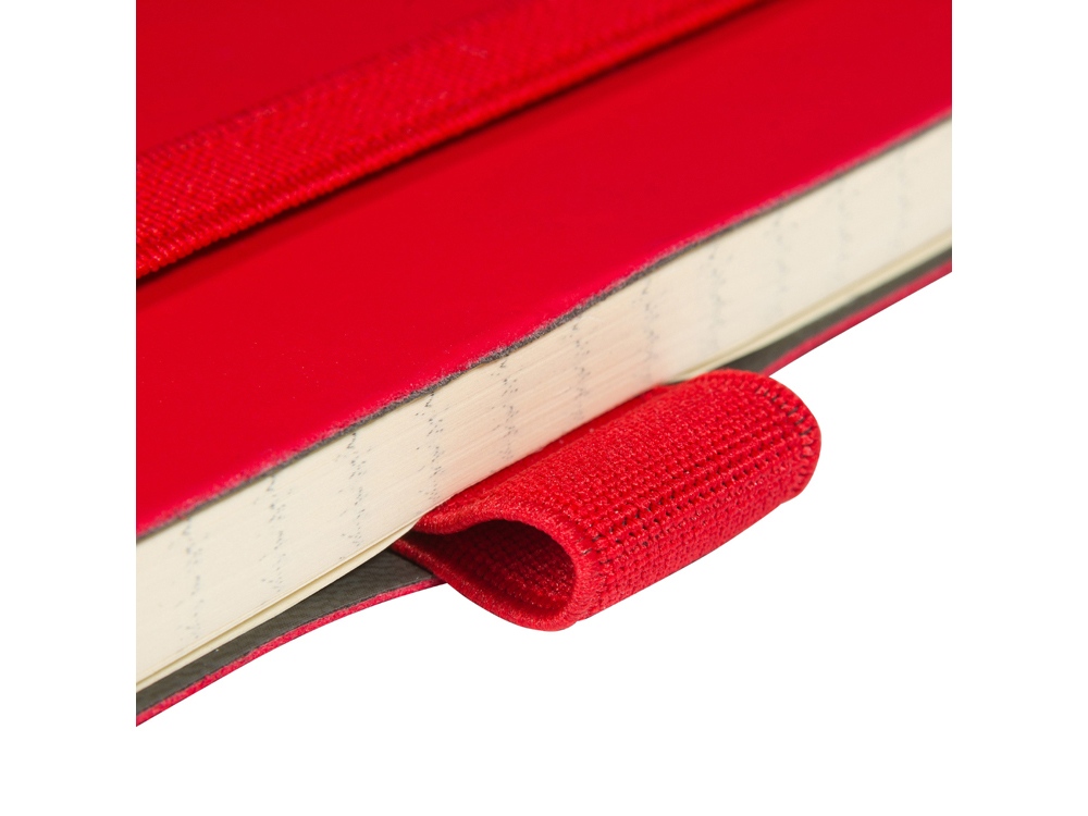 Гибкая (flex) обложка с углами закругленной формы, фиксирующая резинка и ляссе в цвет обложки, петля для ручки и картонный карман для бумаги на внутренней стороне обложки наделяют блокнот практичностью.