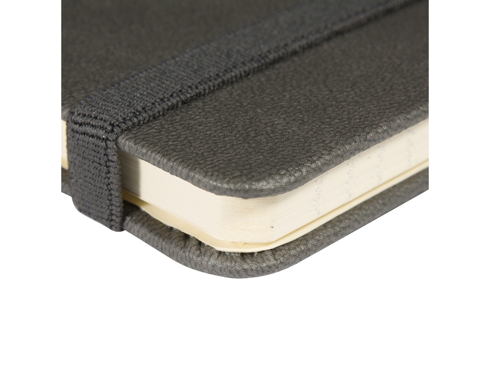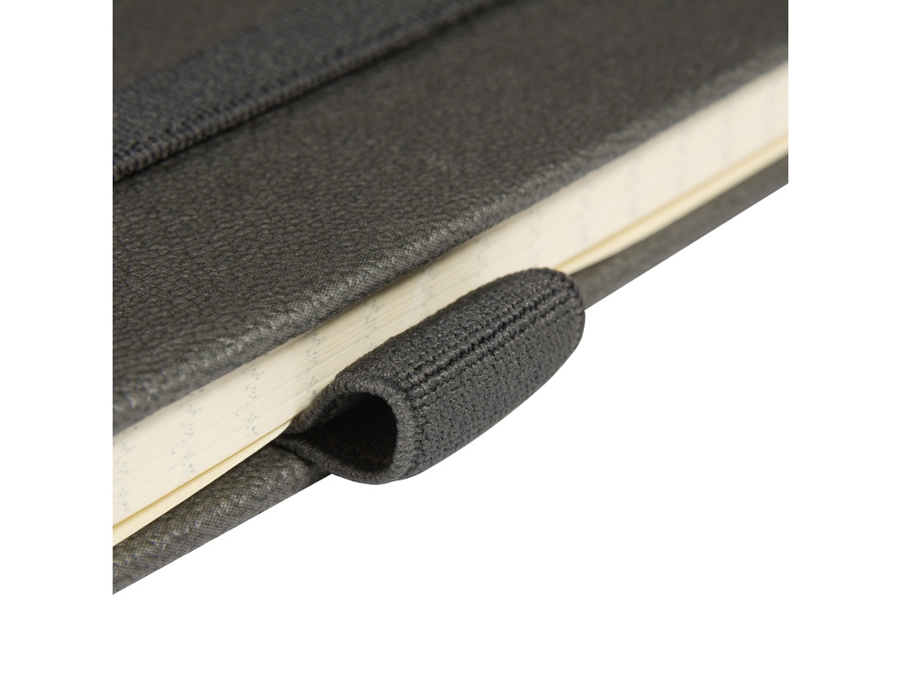 Твердая обложка с углами закругленной формы, фиксирующая резинка и ляссе в цвет обложки, петля для ручки и картонный карман для бумаги на внутренней стороне обложки наделяют блокнот практичностью.