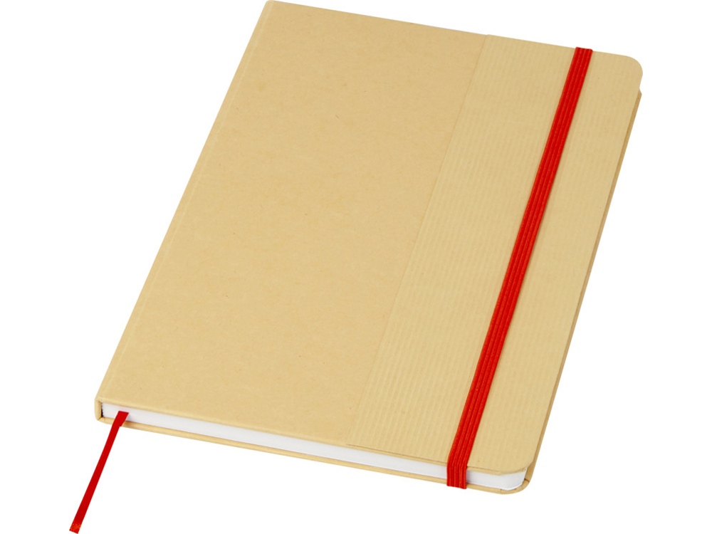 Блокнот формата А5 в твердой обложке из переработанного картона, 80 листов бумаги плотностью 70 г/м² в линейку. Блокнот имеет эластичную застежку, ленту и закругленные углы. FSC certified paper. FSC Mix 100% P7.1 CU-COC-877277.