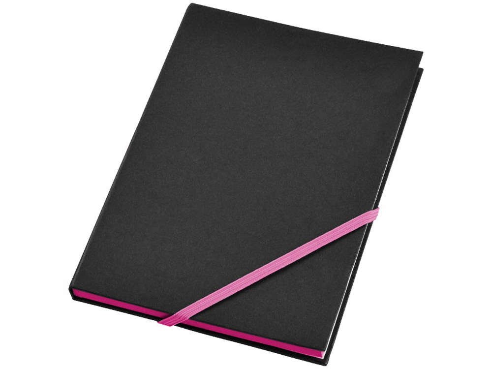 Блокнот, ориентировочный формат A5 с 80 листами бежевой бумаги (70 г/м²) с диагональной эластичной застежкой и яркими неоновыми краями.