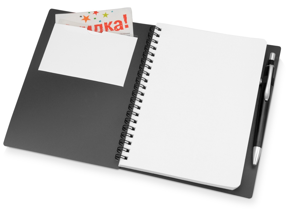 Блокнот Контакт в полипропиленовой обложке переплетен на пружине. В обложке блокнота предусмотрено окошко, в которое можно поместить визитную карточку или полиграфическую вставку. В комплекте с блокнотом идет ручка, которая вставляется в петельку сбоку.