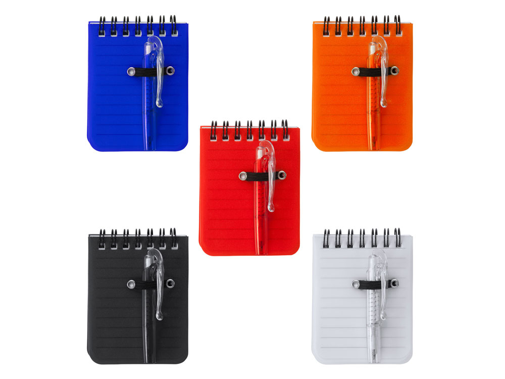 Мини-блокнот на спирали с жесткой полипропиленовой обложкой. 60 листов линованной бумаги. В комплект входит шариковая ручка с синими чернилами.