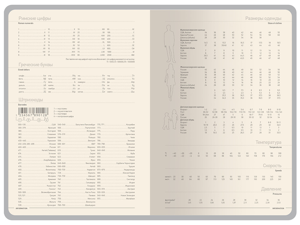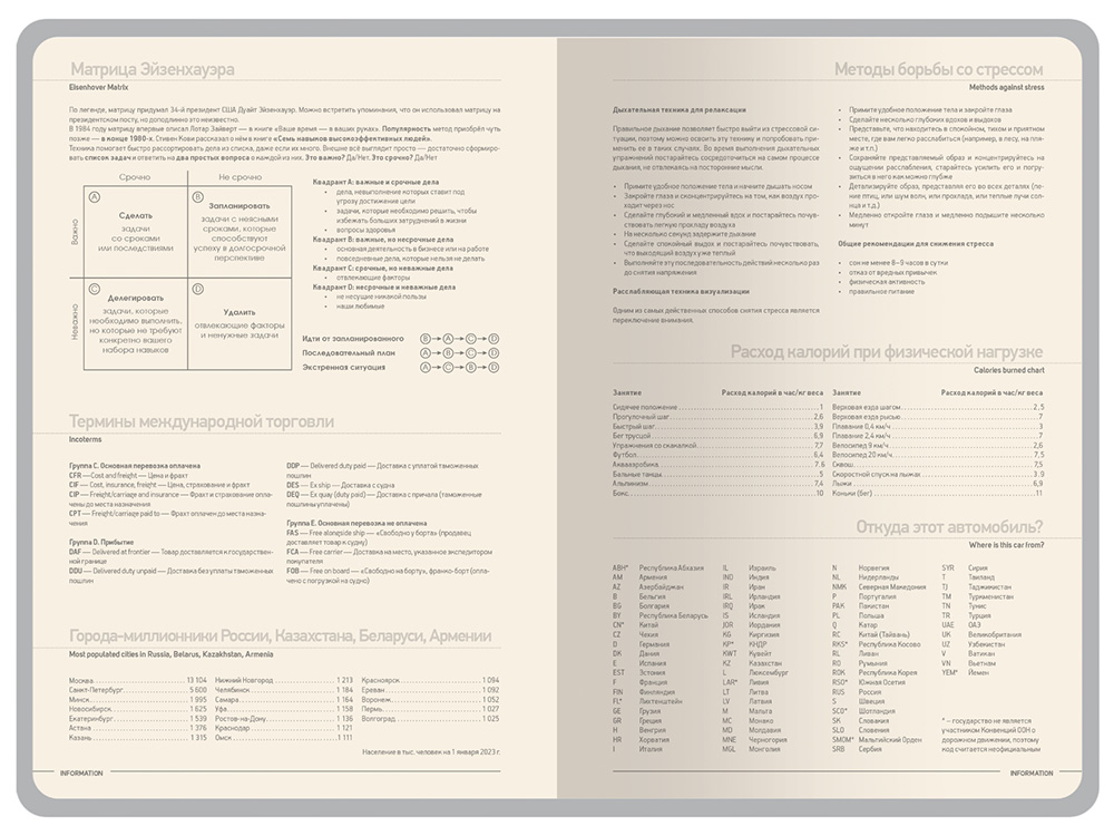 Недатированные страницы в серую линейку имеют отдельное место для проставления числа месяца и дня недели. Справочный блок на 17 страницах содержит полезную информацию из различных областей.