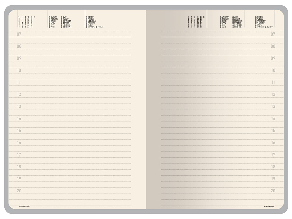 Недатированные страницы в серую линейку имеют отдельное место для проставления числа месяца и дня недели. Справочный блок на 17 страницах содержит полезную информацию из различных областей.
