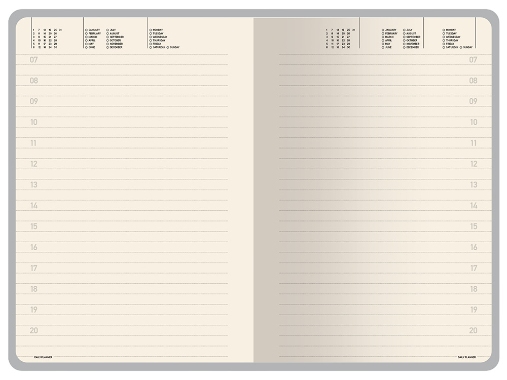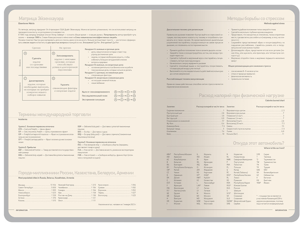Недатированные страницы в серую линейку имеют отдельное место для проставления числа месяца и дня недели. Справочный блок на 17 страницах содержит полезную информацию из различных областей.