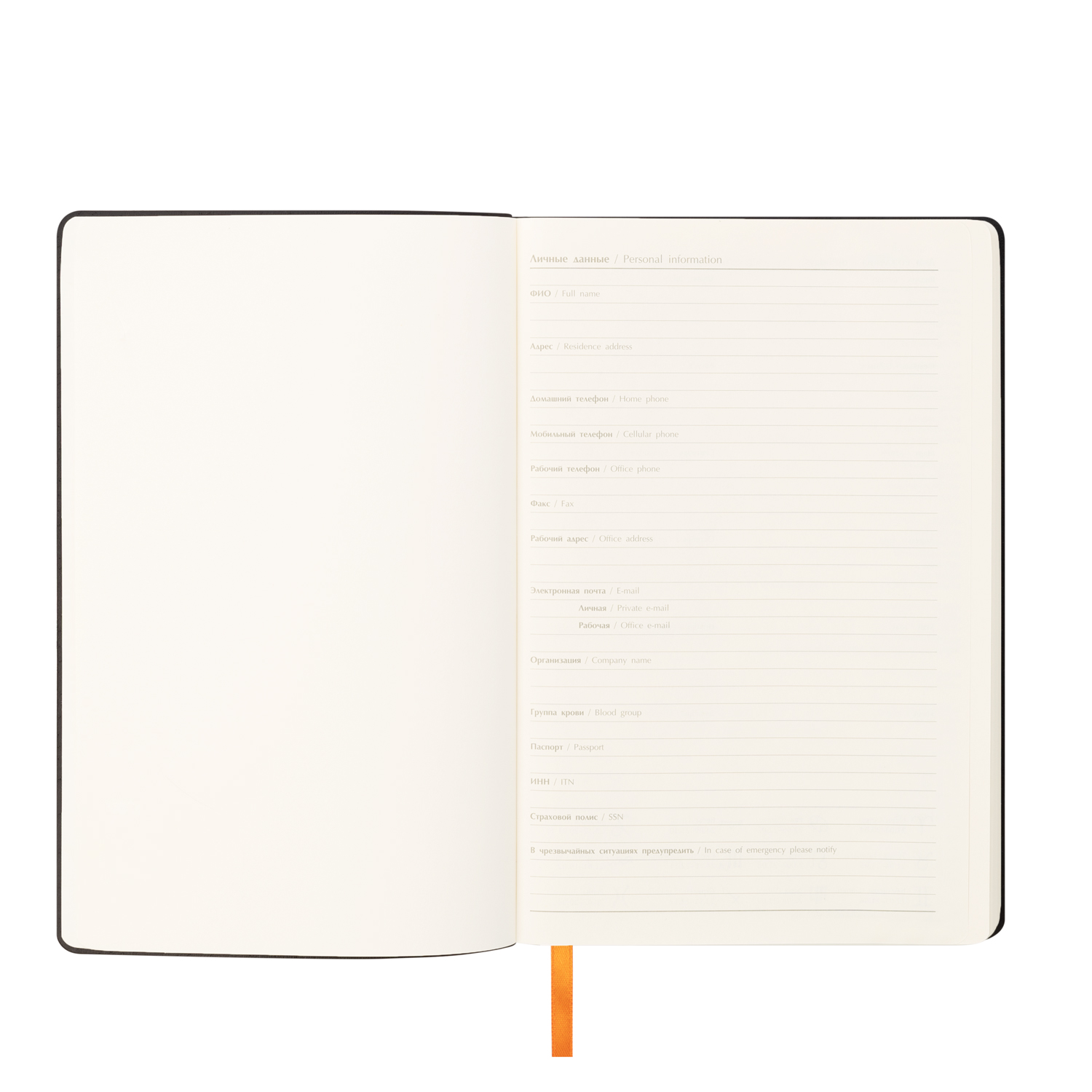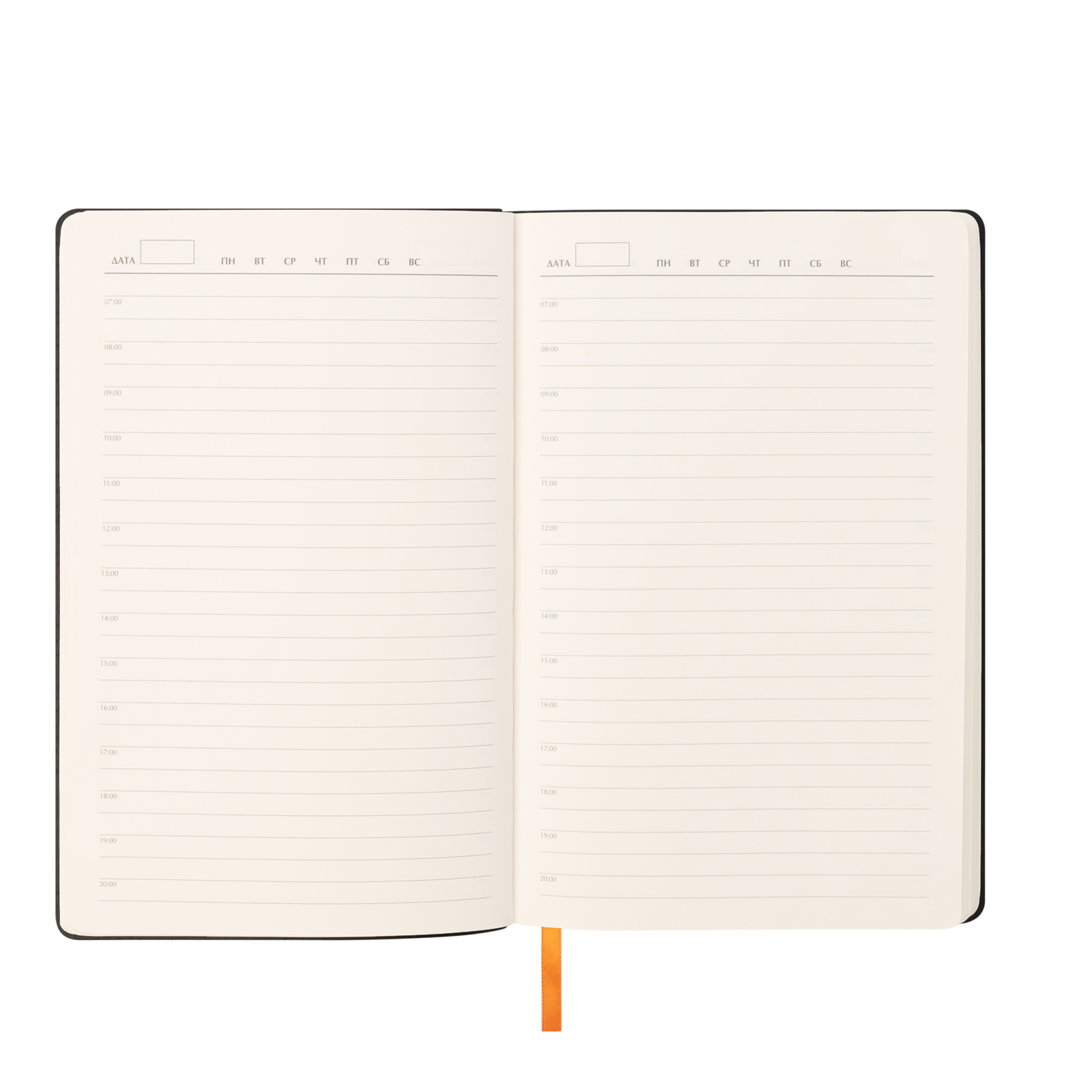 Недатированный ежедневник в гибкой обложке из качественной искусственной кожи со скругленными уголками. Покрытие с эффектом Soft Touch, гладкое, матовое, слегка припудренное, не блестит. Очень приятное на ощупь. Форзац, нахзац и срез кремового цвета.
