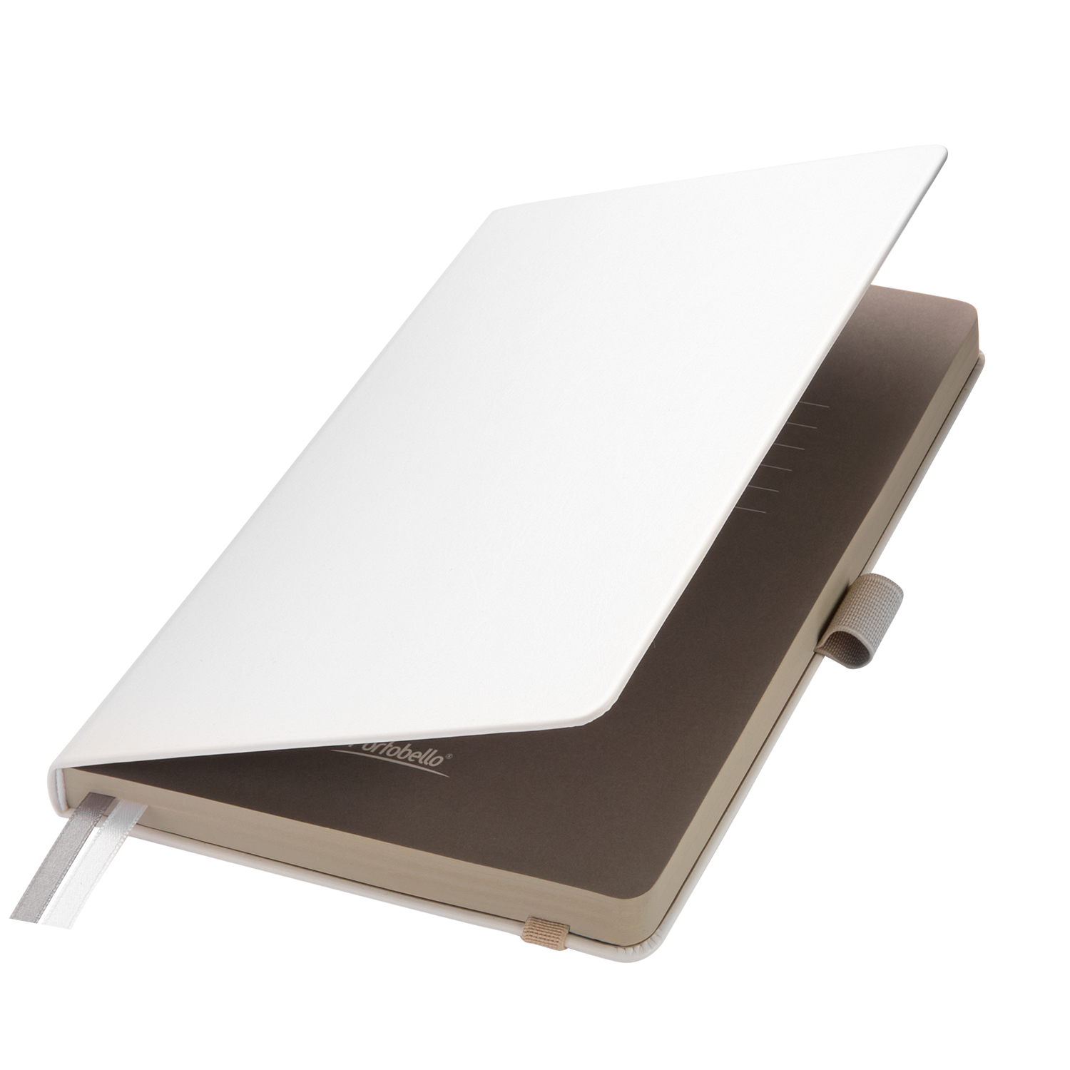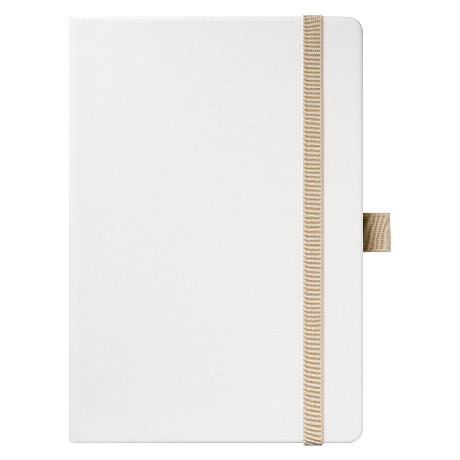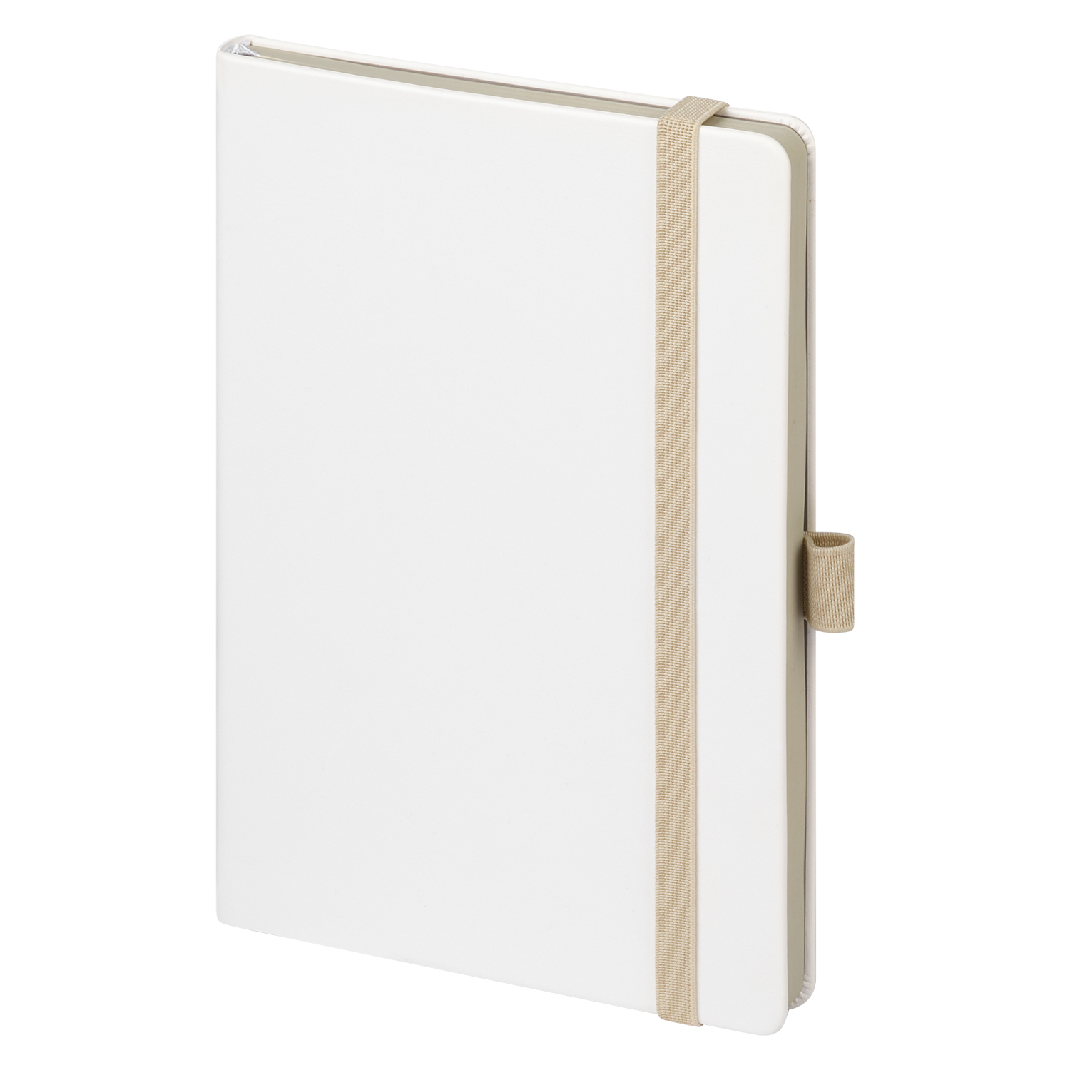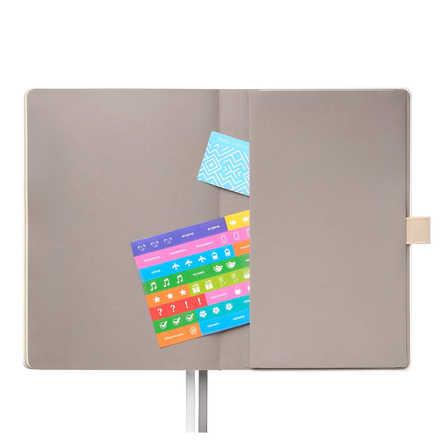 Недатированный ежедневник выполнен в жесткой обложке из искусственной кожи со скругленными уголками. Переплетный материал гладкий, с легкой естественной паутинкой морщин, имеет полуглянцевый блеск. Цвет – чистый белый. Черные матовые форзац и нахзац, а также черный срез блока создают оригинальный динамичный цветовой ансамбль и подчеркивают белизну обложки. Страницы светло-кремового цвета, из гладкого офсета, слегка шелковистые, со скругленными уголками. Добавляют изделию мягкую комфортную теплоту. Двойное атласное ляссе составлено из черной и белой лент. Каждая шириной 6 мм, имеет легкий блеск. Вертикальная фиксирующая резинка прочная, надежная и удобная, в тон срезу. Есть петелька для ручки в тон резинки. Карман на заднем форзаце.