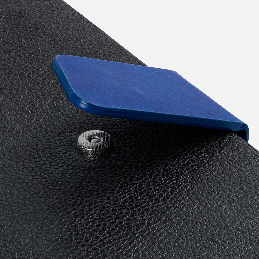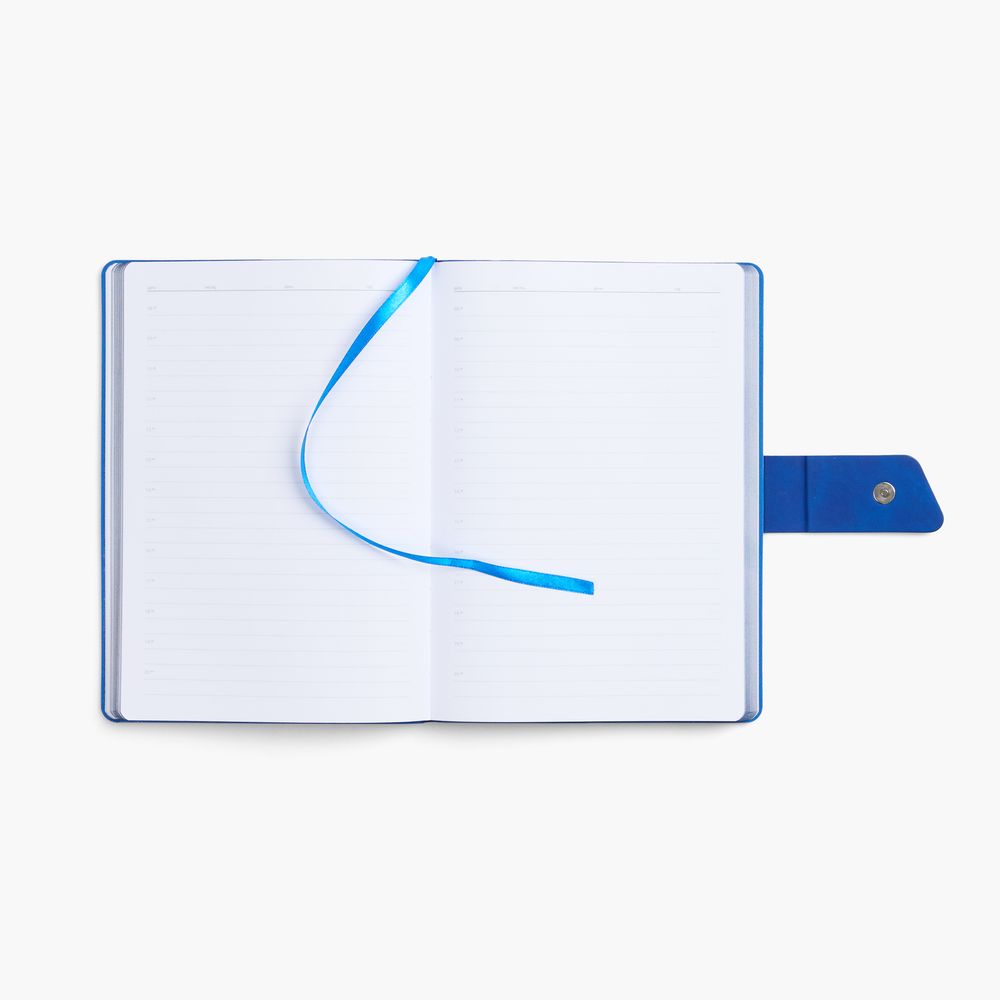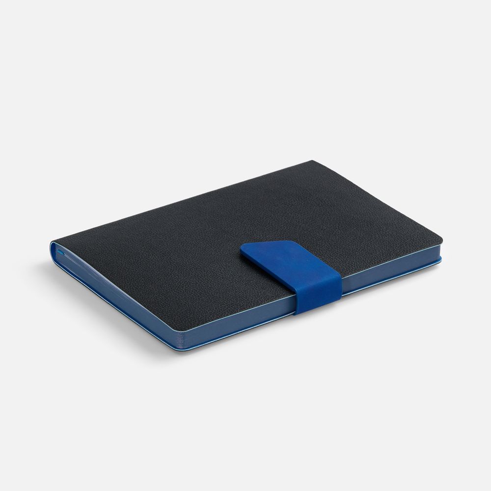 Ежедневник с гибкой обложкой, выполнен из материала La Fite, черный АА и Nubuck Touch, голубой, дополнен голубым ляссе и хлястиком на кнопке.