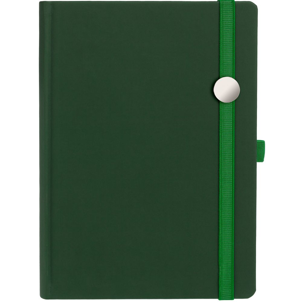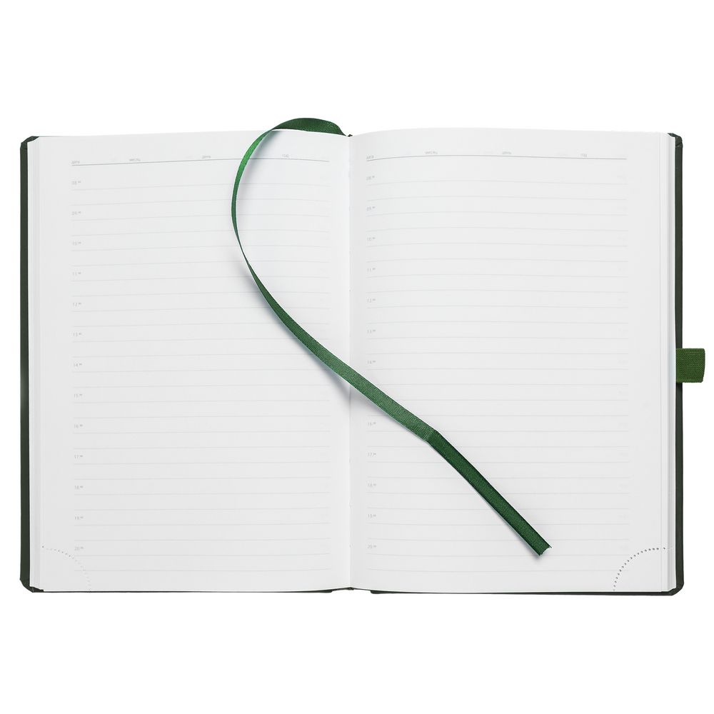 Ежедневник с твердой обложкой без поролона, выполнен из материала Soft Touch Ultra, зеленый FF, дополнен резинкой шириной 1 см, петлей-резинкой для ручки, капталом и ляссе ярко-зеленого цвета.