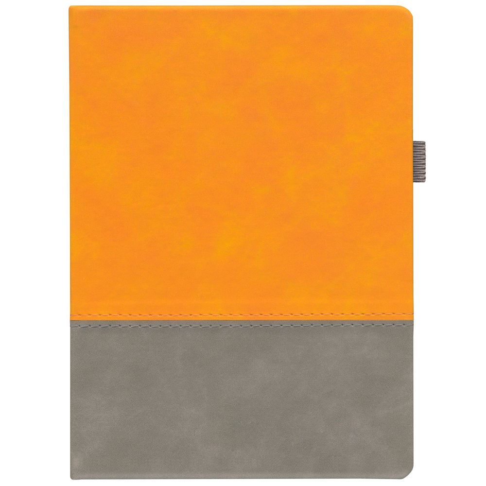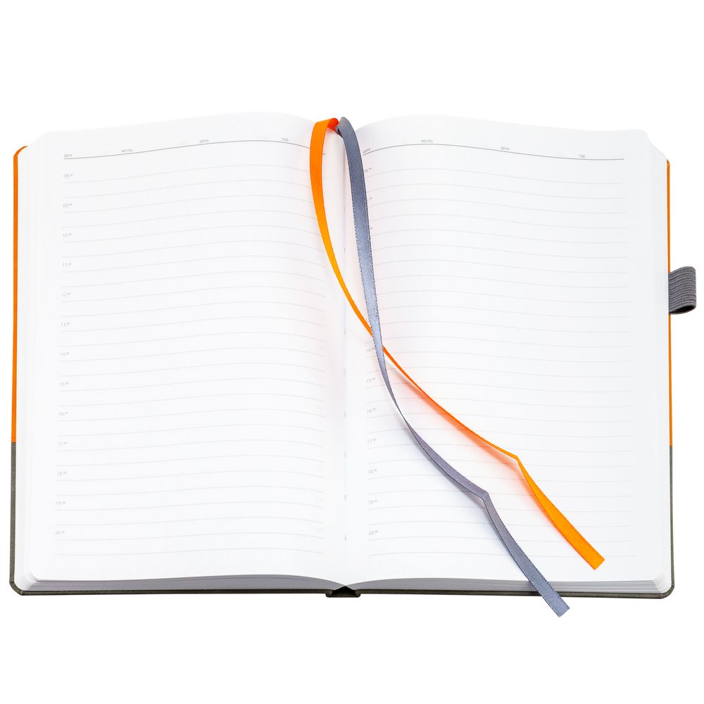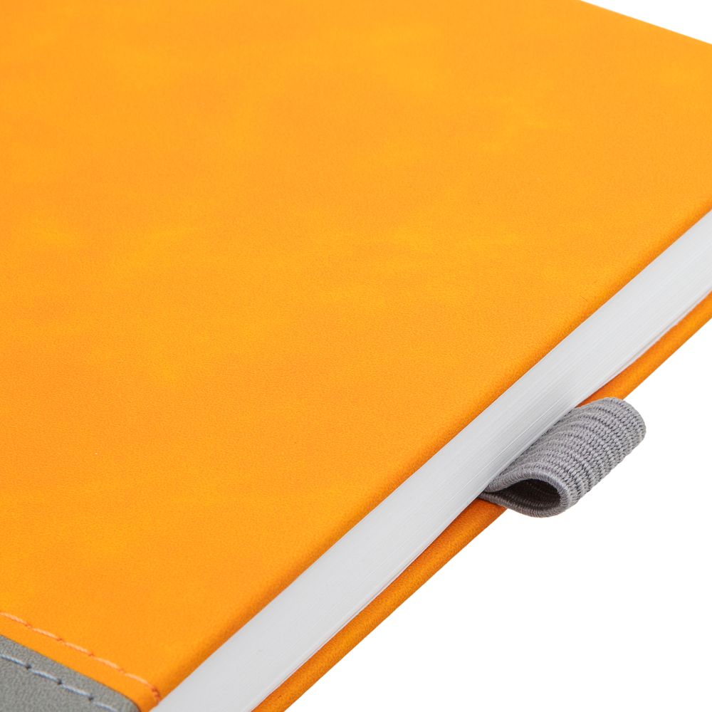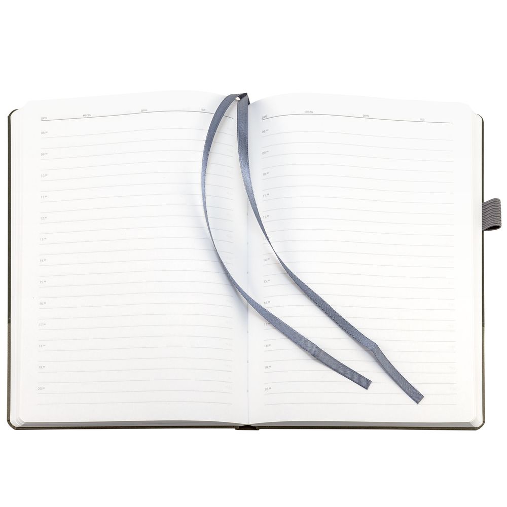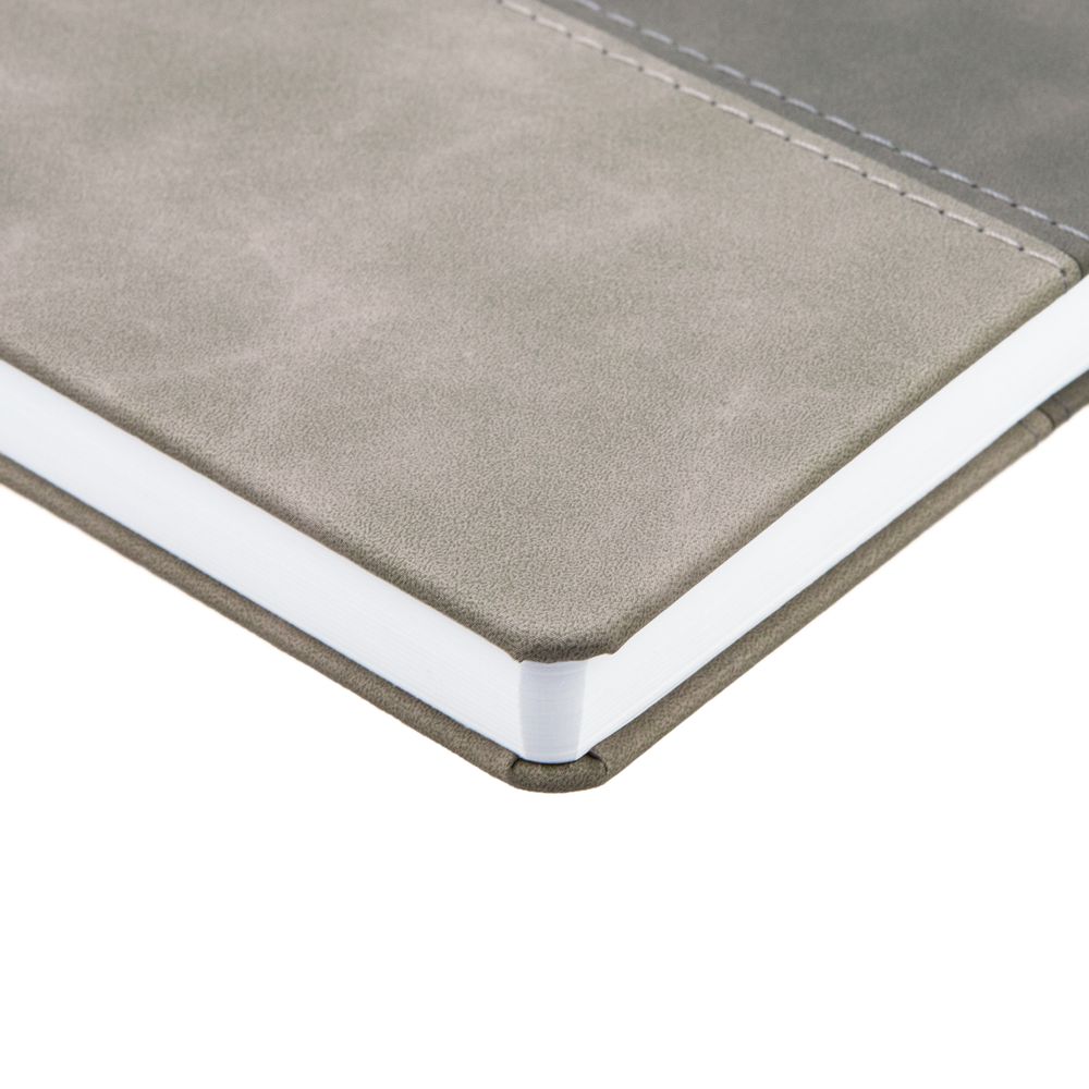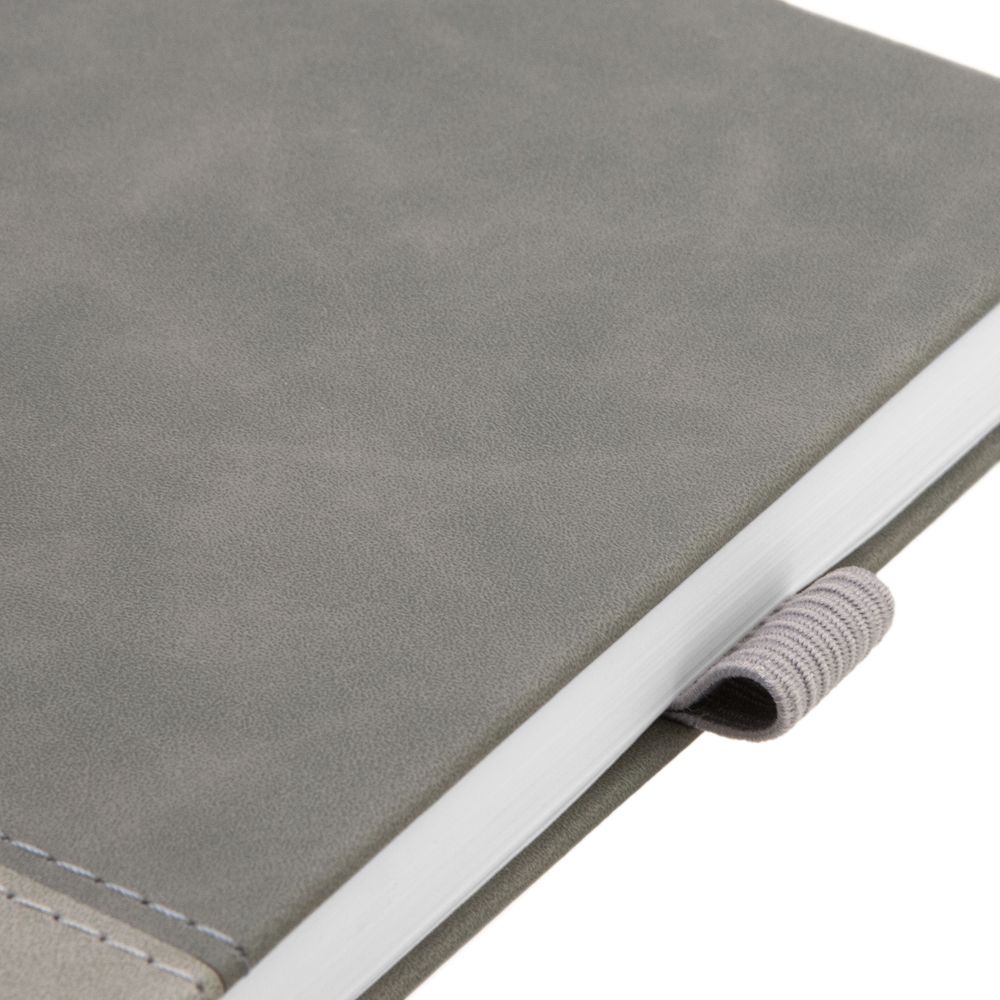 Ежедневник с твердой обложкой, без поролона, со сшивкой материалов Nubuck Touch, серый СС, и Nubuck Touch голубой JJ, дополнен двойным ляссе и петлей-резинкой для ручки.