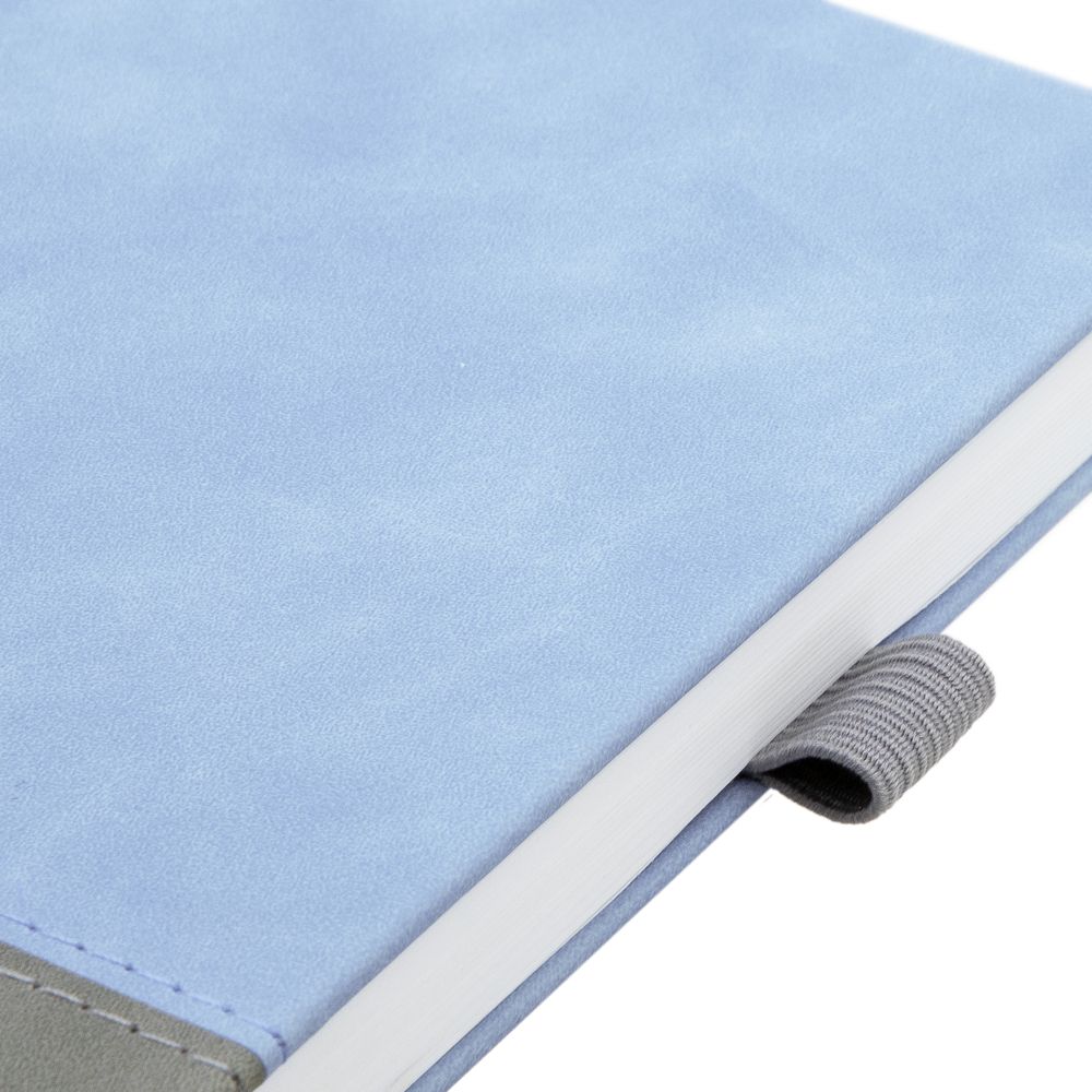 Ежедневник с твердой обложкой, без поролона, со сшивкой материалов Nubuck Touch, серый СС, и Nubuck Touch голубой JJ, дополнен двойным ляссе и петлей-резинкой для ручки.