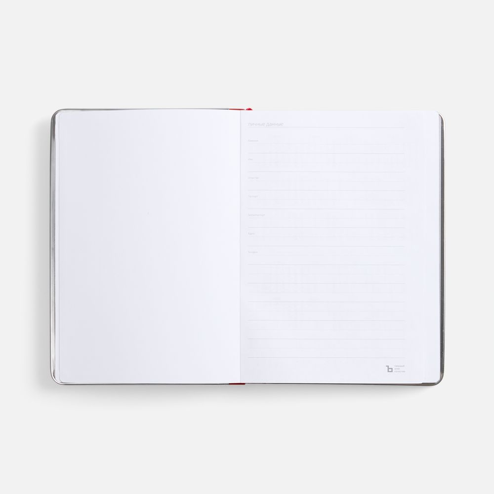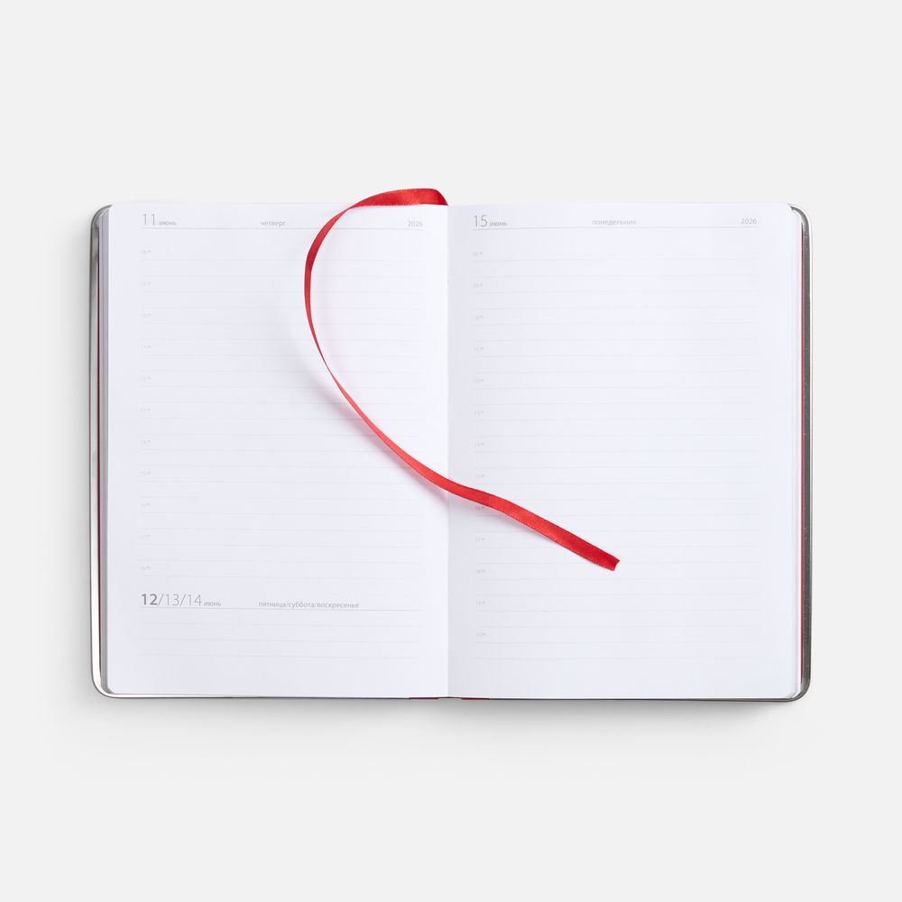 Ежедневник с твердой обложкой и серебристым обрезом блока. Выполнен из материала Nubuck, красный РР, дополнен красным ляссе и металлическими рамками с двух сторон обложки.