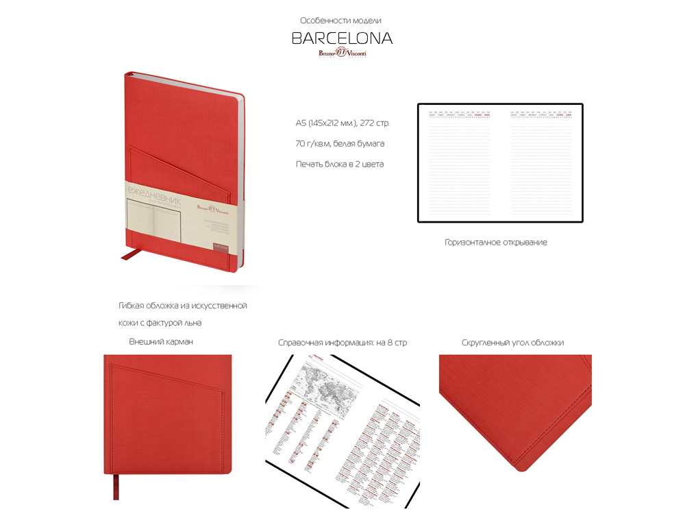 Это ежедневник предназначен для тех, кто отдает предпочтение строгости. Телефон, ручка, визитки и листы для записей будут всегда под рукой благодаря удобному карману на фронтальной стороне. В недатированном ежедневнике Barcelona зеленого цвета используется белая бумага плотность 70 г/м. Ляссе благородного бордового цвета сочетается с обложкой. Скругленный угол - фирменная особенность ежедневников Bruno Visconti. Справочная информация на 8 страницах. Ежедневник Barcelona упаковывается в картонный полукороб и термопленку.