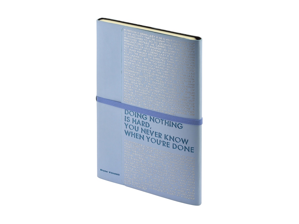 Так трудно ничего не делать, ведь совершенно непонятно, когда ты закончишь! Лаконичный слоган мотивирует к активным действиям. Планируй и завершай! Вот что кроется в элегантной надписи, выполненной золотым тиснением! А Flex обложка напоминает Будь гибким! Великолепный недатированный ежедневник Bilbao черно-синего цвета с тиснением фольгой. Бежевая бумага 65 г/м, широкая горизонтальная фиксирующая резинка. Гибкая обложка с покрытием Soft-touch. Особенность этого ежедневника - часть обложки внахлест может использоваться как закладка. Ежедневник упакован в картонный полукороб и термопленку.