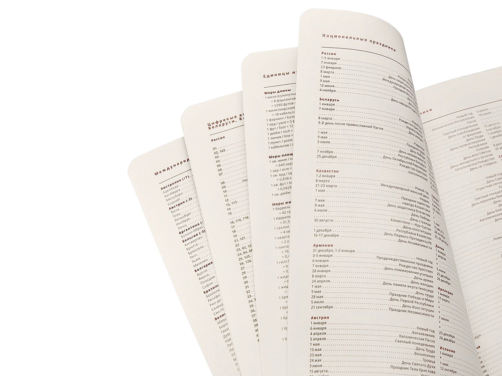 - раздел справочной информации на 17 страницах (часовые пояса, аэропорты Европы, международные телефонные коды, размер одежды, телефонные коды России, Беларуси, Казахстана, Армении, цифровые автомобильные коды, римские цифры, расход калорий при физической нагрузке, формат бумаги, десятичные приставки, единицы измерения, греческие буквы, штрихкоды, время распада алкоголя в крови, города-миллионники, национальные праздники, термины международной торговли, температура, скорость, давление, буквенные коды стран, энергетическая и питательная ценность продуктов, страны мира, заметки);