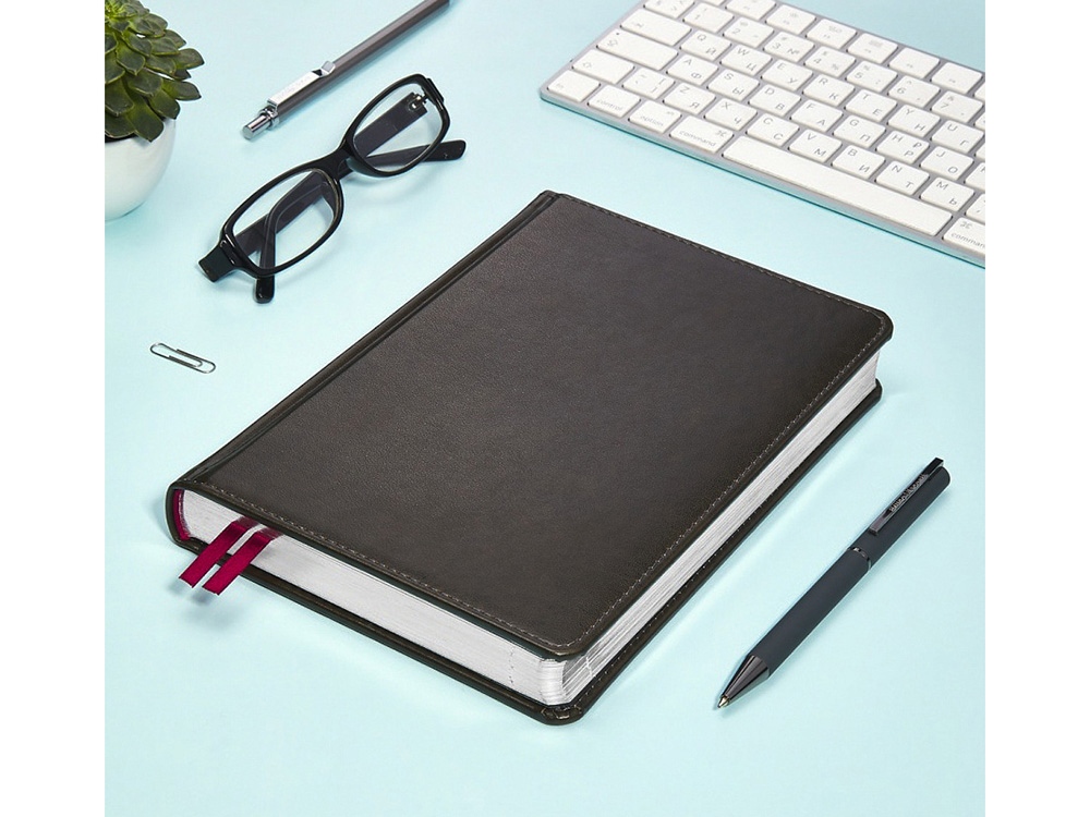 - твердая обложка из высококачественной экокожи с декоративной нитью по периметру в тон ежедневника;