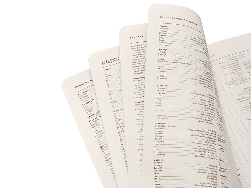 - раздел справочной информации на 17 страницах (часовые пояса, аэропорты Европы, международные телефонные коды, размер одежды, телефонные коды России, Беларуси, Казахстана, Армении, цифровые автомобильные коды, римские цифры, расход калорий при физической нагрузке, формат бумаги, десятичные приставки, единицы измерения, греческие буквы, штрихкоды, время распада алкоголя в крови, города-миллионники, национальные праздники, термины международной торговли, температура, скорость, давление, буквенные коды стран, энергетическая и питательная ценность продуктов, страны мира, заметки);