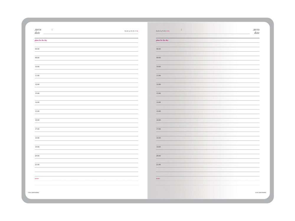 В ежедневнике Sidney Nebraska есть полезная справочная информация и телефонная книга на 18 листов, а также 272 страницы для записи идей, мыслей и составления рабочих планов. Для изготовления страниц используется качественный белый офсет повышенной плотности (70 г/кв м) с серебристым срезом, который производится в Японии и подходит для всех видов чернил. Разметка блока с указанием времени позволяет планировать дела с точностью до 1 часа.
