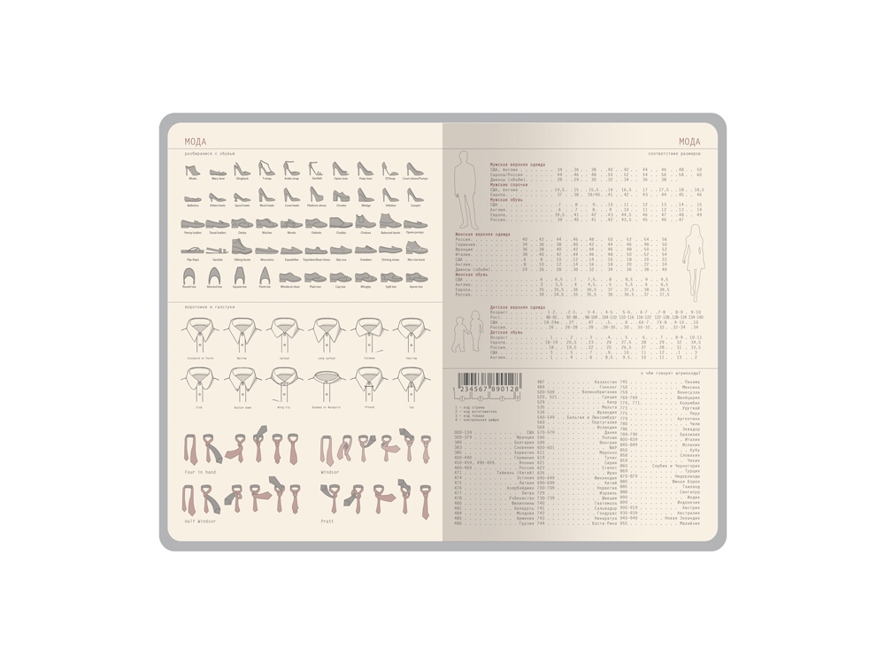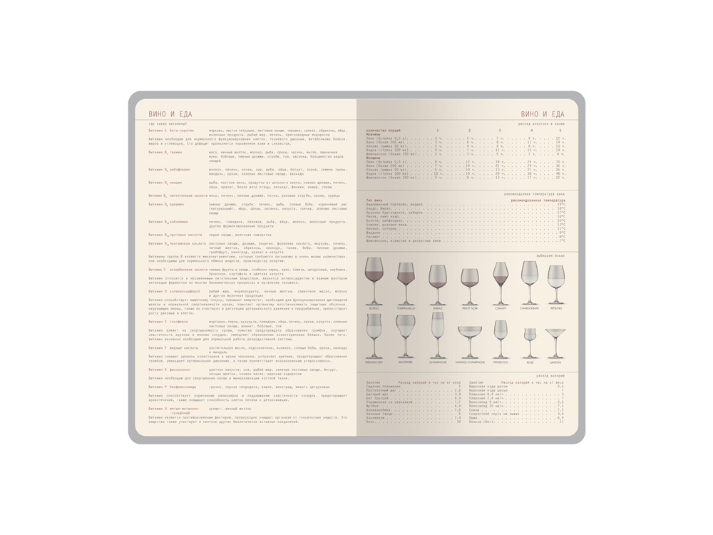Ежедневник формата А5 имеет внутренний блок из 272 страниц. Блок изготовлен из бежевой бумаги плотностью 70 г/м2 и содержит: