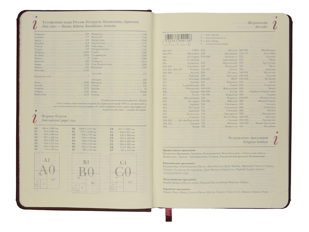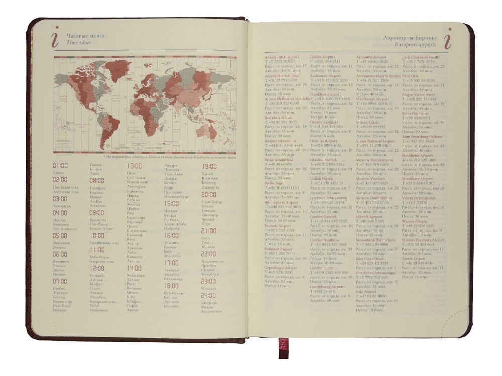 Незаменимый помощник в деле эффективного планирования благодаря высокому качеству производства и тщательно продуманных элементов: мягкая бархатистая обложка со скругленными уголками и строчкой по периметру в цвет, вырубные индексы с цветной маркировкой, разбивающей блок на месяцы, закладка-ляссе, перфорированные углы блока, линовка листов с указанием времени суток.