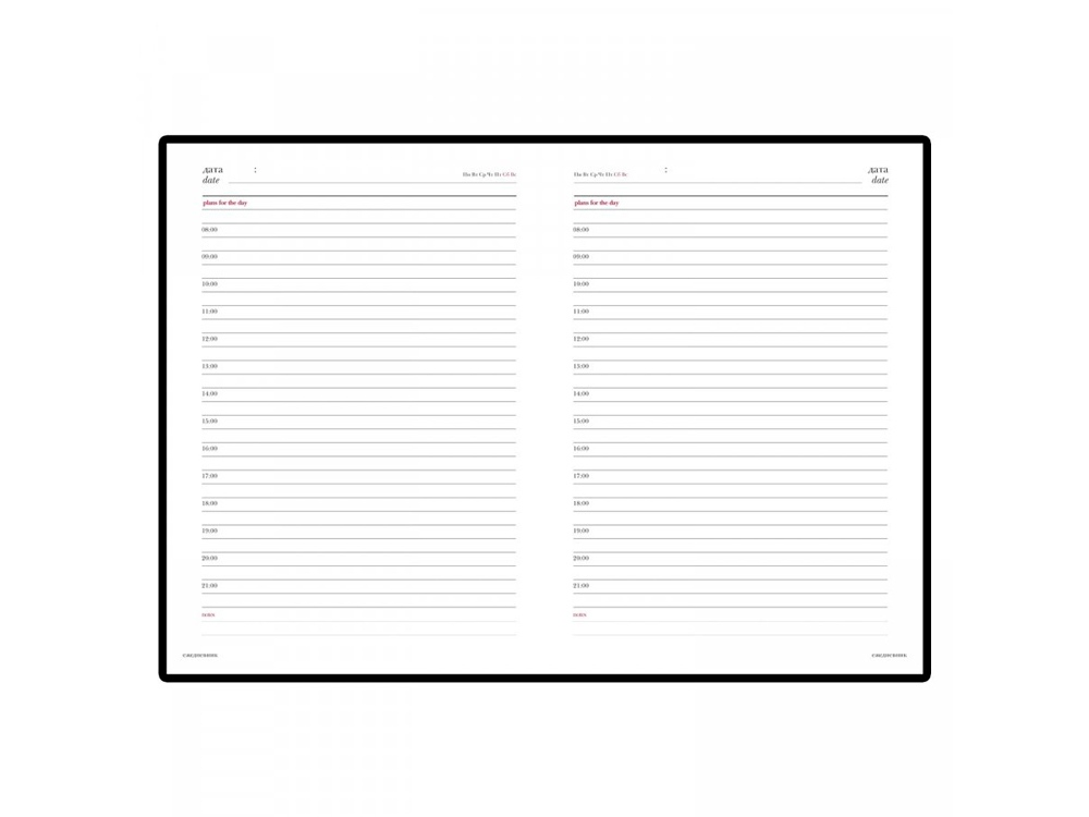 В ежедневнике Sidney Nebraska есть полезная справочная информация и телефонная книга на 18 листов, а также 272 страницы для записи идей, мыслей и составления рабочих планов. Для изготовления страниц используется качественный бежевый офсет повышенной плотности (70 г/кв м), который производится в Японии и подходит для всех видов чернил. Разметка блока с указанием времени позволяет планировать дела с точностью до 1 часа.