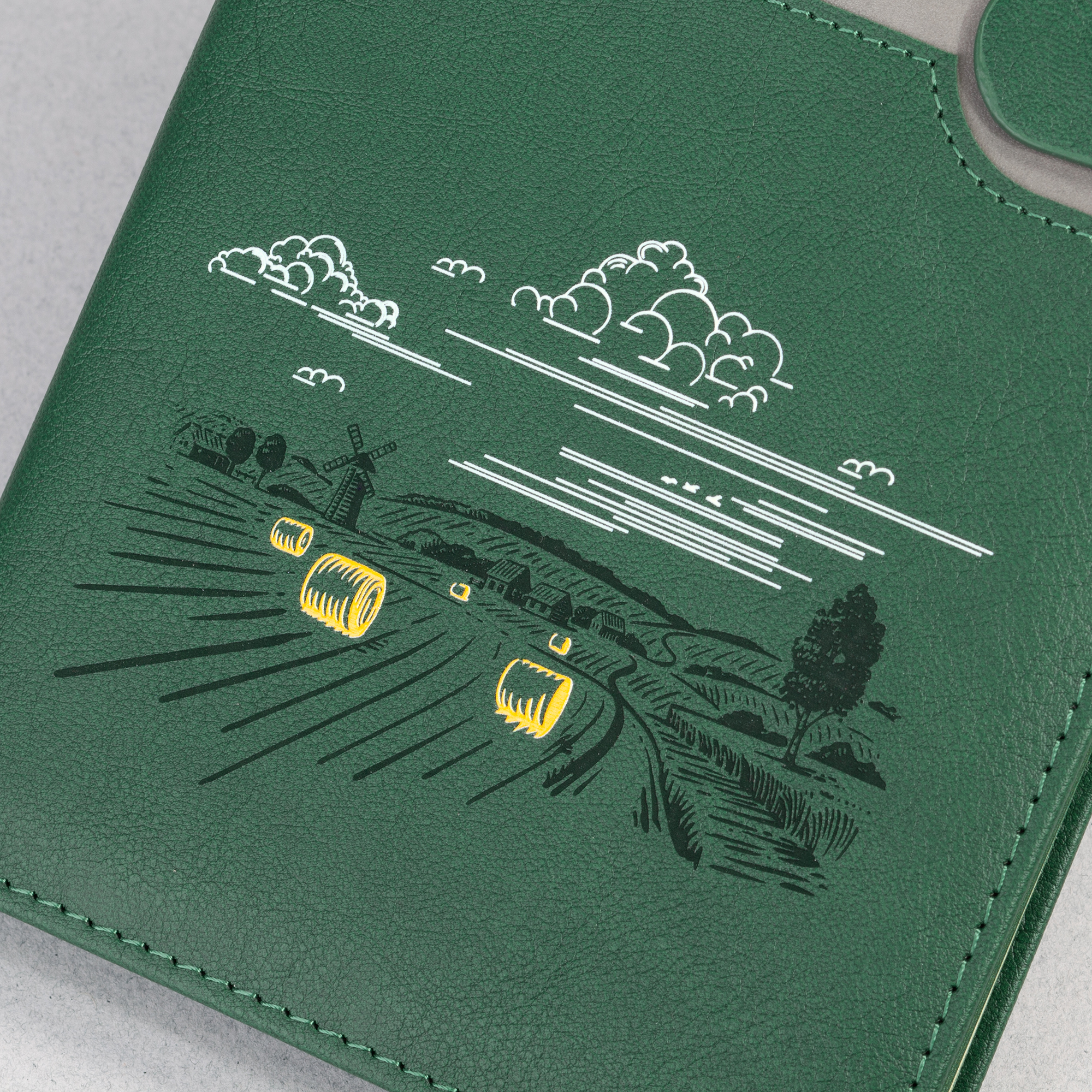 Матовая плотная обложка с выраженной текстурой натуральной кожи дополнена стильным вырезом – полосой серого цвета с прошивкой по периметру. Внутренний блок включает 256 страниц из бумаги плотностью 70 гр., срезом в цвет обложки и закладкой-ляссе, благодаря которой его удобно сразу открывать на нужной странице.