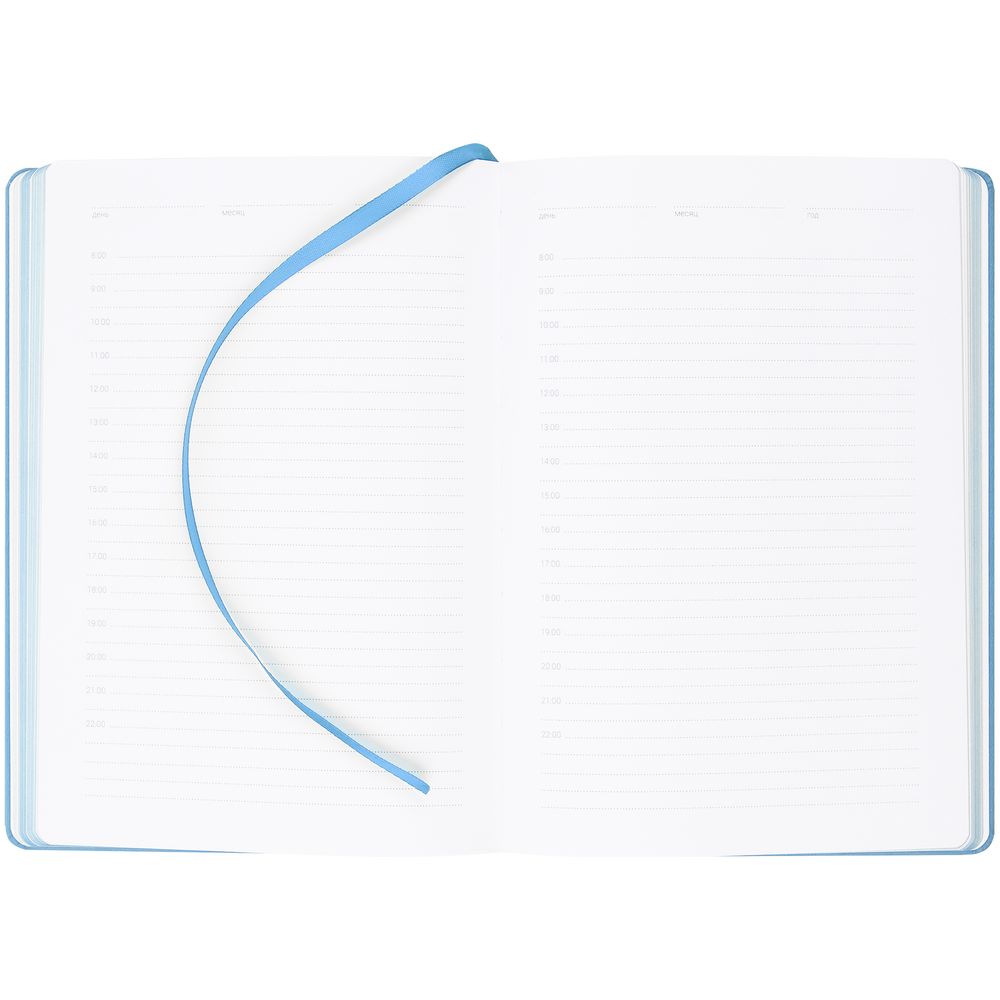 Ежедневник с твердой обложкой, выполнен из материала Latte, желтый КК, обрез зеленого цвета, дополнен ляссе желтого цвета и резинкой с металлическим шильдом.