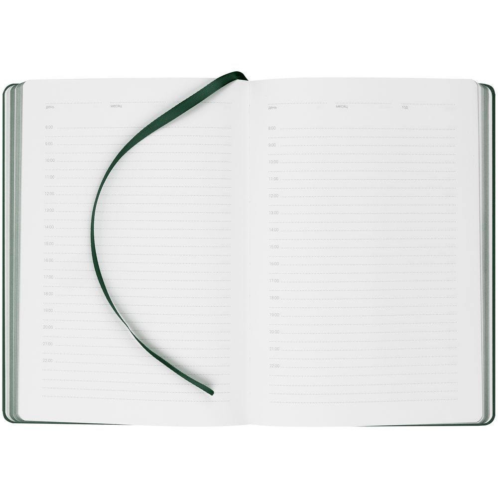 Ежедневник с твердой обложкой, выполнен из материала Latte, желтый КК, обрез зеленого цвета, дополнен ляссе желтого цвета и резинкой с металлическим шильдом.